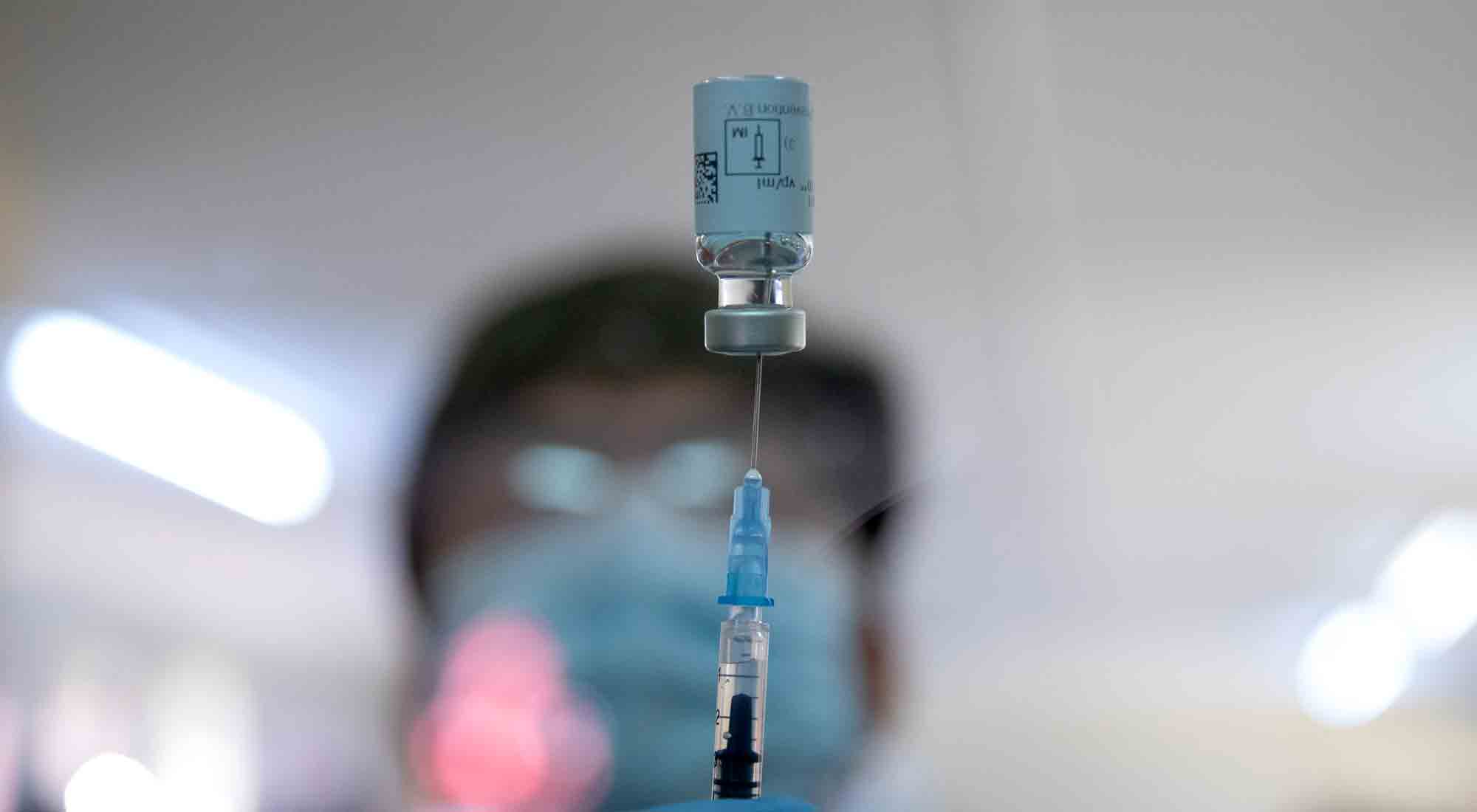 一名医护人员从一个瓶子中用注射器抽取了一剂强生疫苗。