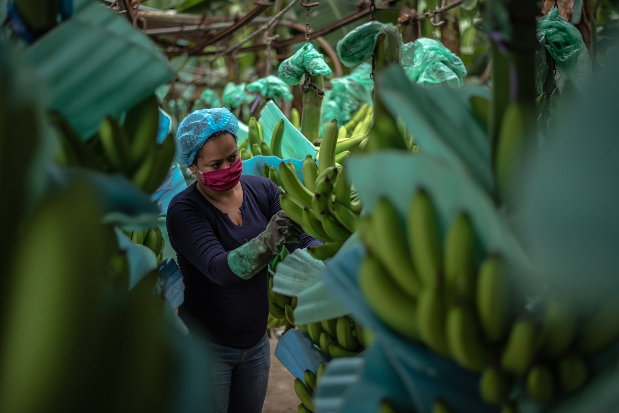 一名穿着防护服的工人在厄瓜多尔米拉格罗的一个种植园修剪香蕉串。