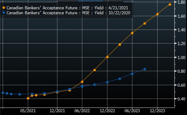 尽管加元暴涨,加拿大债券仅略有走弱。尽管如此,投资者似乎对加拿大寄予了更多期望。看看这条曲线,作为国内利率预期的代理:相对于六个月前,加息前景已经大幅提升。