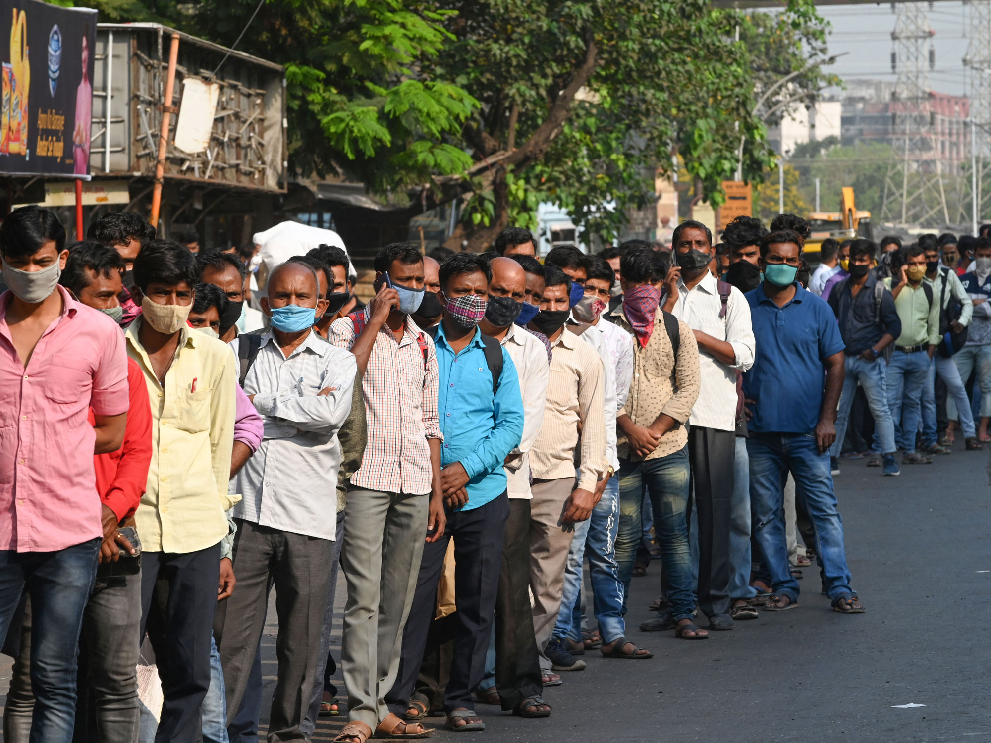 在2021年3月21日,孟买的通勤者排队上公交车。