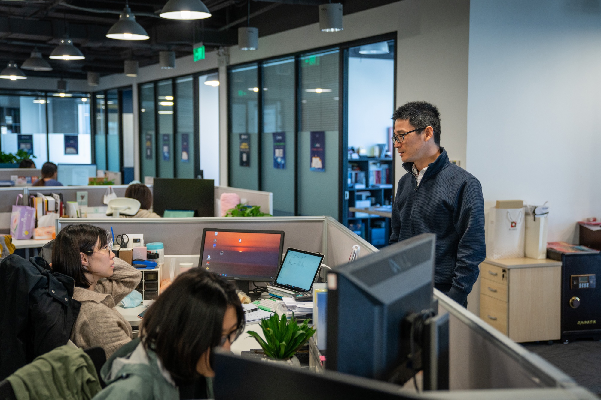 钱在922号办公室与同事交谈。摄影师:Yan Cong/Bloomberg钱站在922号办公室的后面,微笑着点头,听着人们讲述长时间等待的困难。“从煤炭公司到石油生产商,从环境官员到甚至文化和宣传部门,所有人都在谈论碳中和,”他说。“如果去年我对碳市场的努力感到沮丧,认为结果永远不会出现,那么今天我更担心我们无法快速行动以抓住所有的机会。”