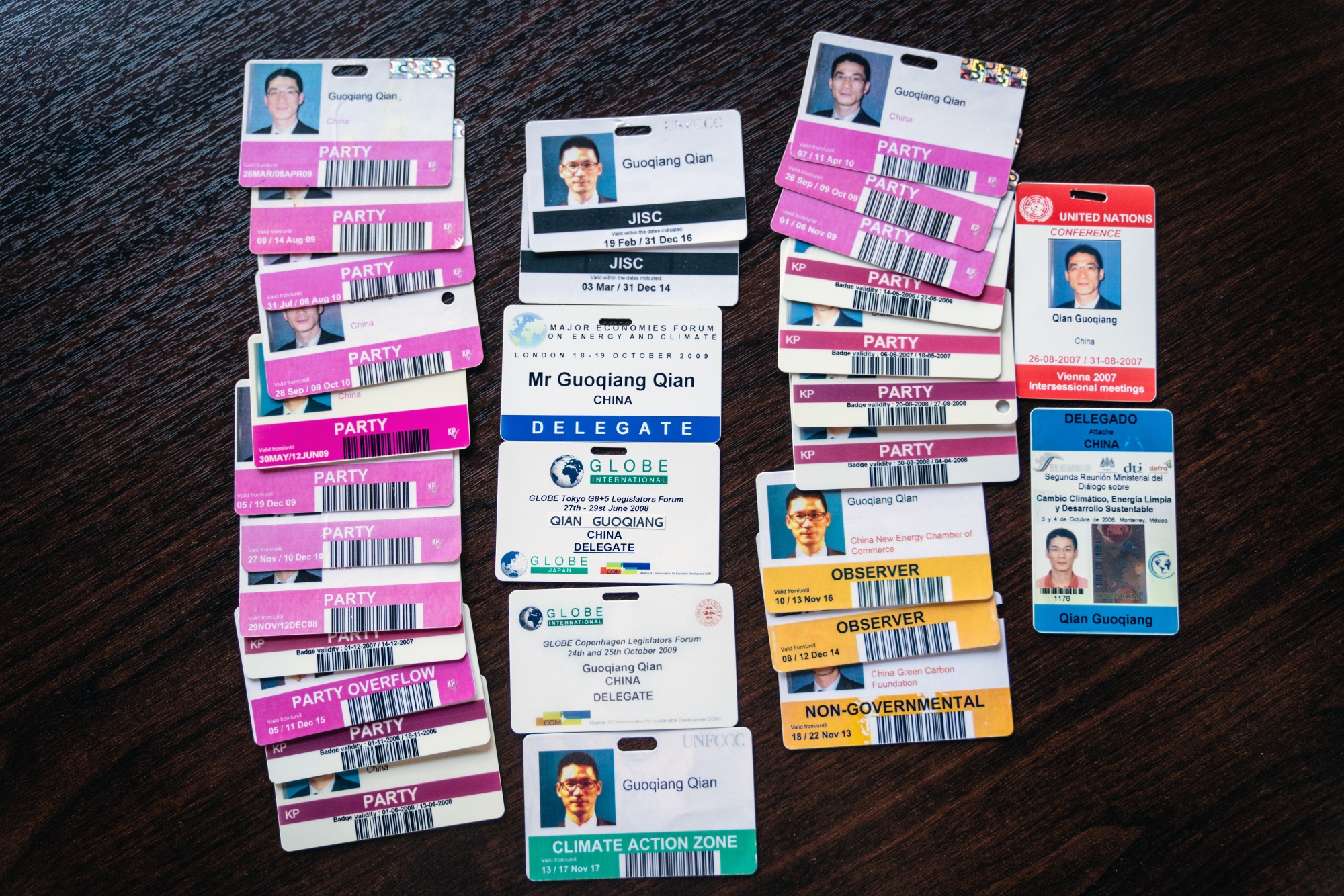 钱国强过去参加的国际气候会议通行证。摄影师:Yan Cong/Bloomberg“你无法想象我们投入了多少热情和努力,以及我们多少次感到迷茫,”钱在他的办公室接受采访时说。