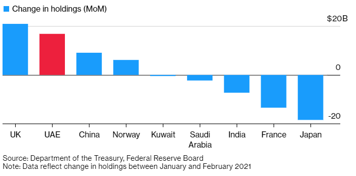 在美国债券市场多年来最糟糕的一个月中,阿联酋成为二月份购买美国国债第二大的国家,购买了比中国更多的避险证券。这个海湾国家将其储备增加约170亿美元至506亿美元,使其持有量达到2019年全球大流行病和油价暴跌之前的水平。