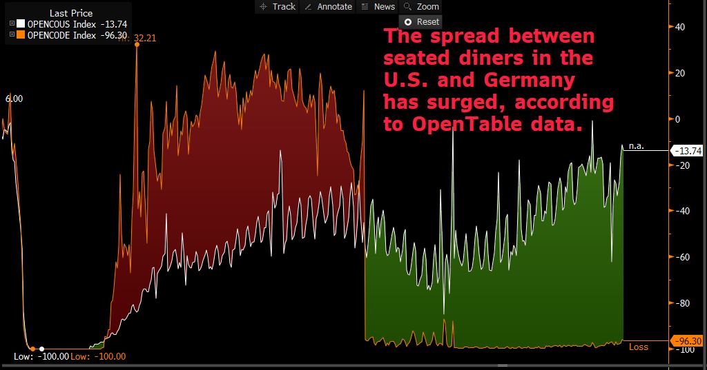 OpenTable美国与德国就座用餐者同比数据Bloomberg去年大流行的爆发在不同国家以不同速度发生。但世界上大部分地区都面临某种形式的限制。现在,随着疫苗接种推动恢复正常,不同速度的复苏有可能变得更加极端,甚至可能在为时已晚之前不被注意和重视。
