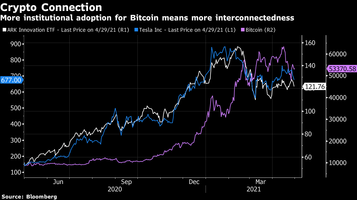 比特币机构采用的反面是,它与金融系统的联系更紧密了。想想ARK基金,通过GrayScale比特币信托拥有特斯拉和比特币。特斯拉现在也拥有比特币,因此ARK的风险暴露比人们预期的要高,而特斯拉的命运与比特币有着多重联系。即使更加保守的资产管理者可能会发现自己暴露于加密货币,因为越来越多的公司将其用于多样化现金余额。当然,随着机构接受程度的提高,加密货币市场本身也在迅速增长,据估计本月已超过2万亿美元。