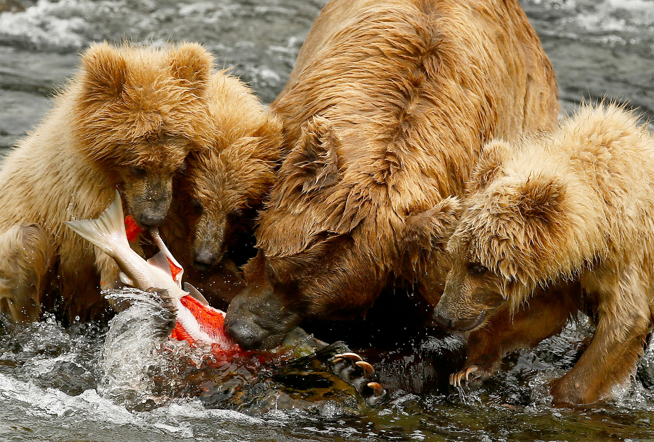 一只母熊和她的三只幼崽在2019年在阿拉斯加的卡特迈国家公园撕开并吃掉了一条红鲑鱼。摄影师:路易斯·辛科/洛杉矶时报/盖蒂图片社气候变化和其他威胁已经动摇了世界上最后一片野生鲑鱼的栖息地之一,可能会改变美国广受追捧的鱼类出口销售。