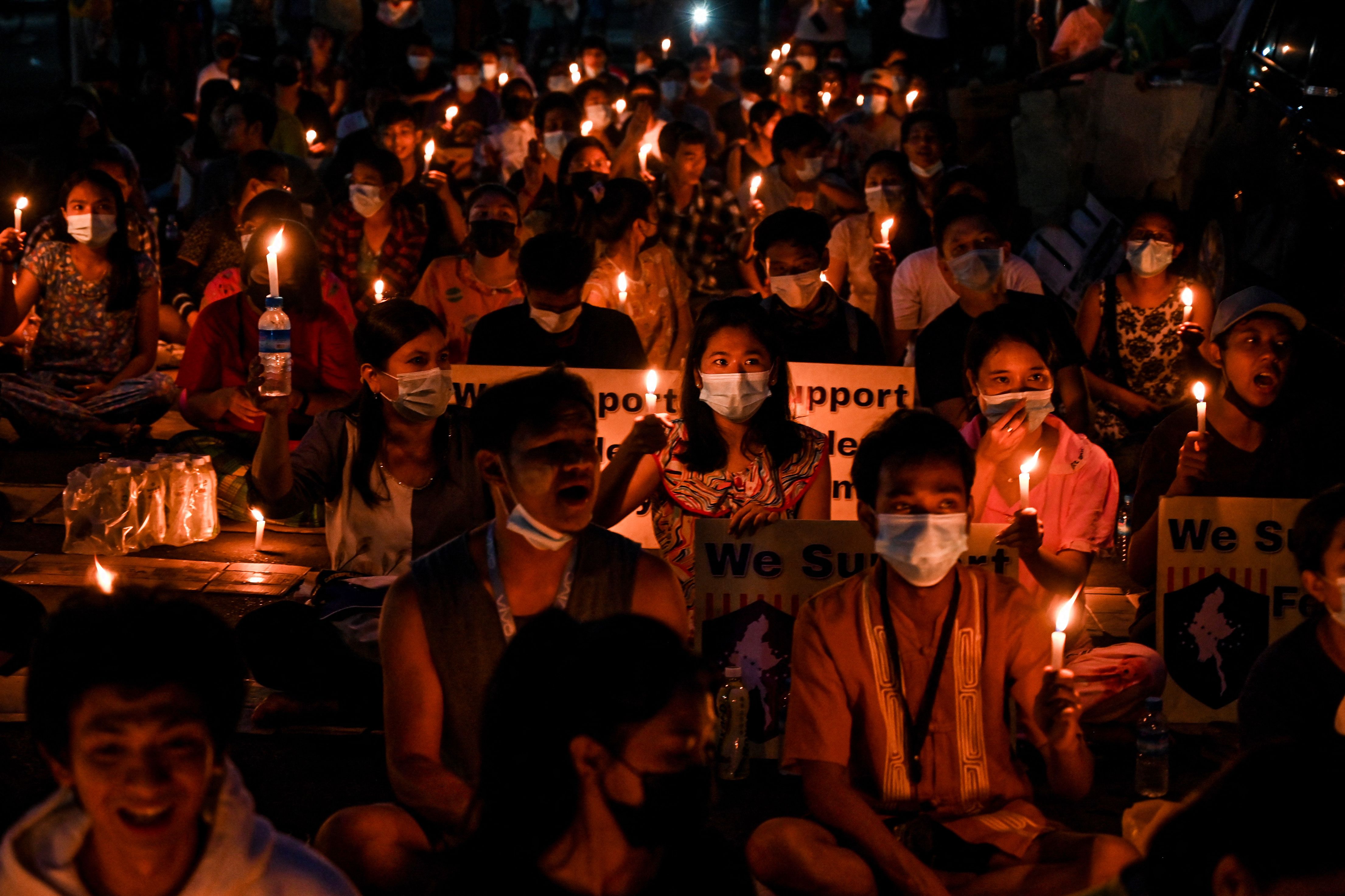 4月3日在仰光举行的反政变烛光示威活动的抗议者。来源:法新社/盖蒂图片社