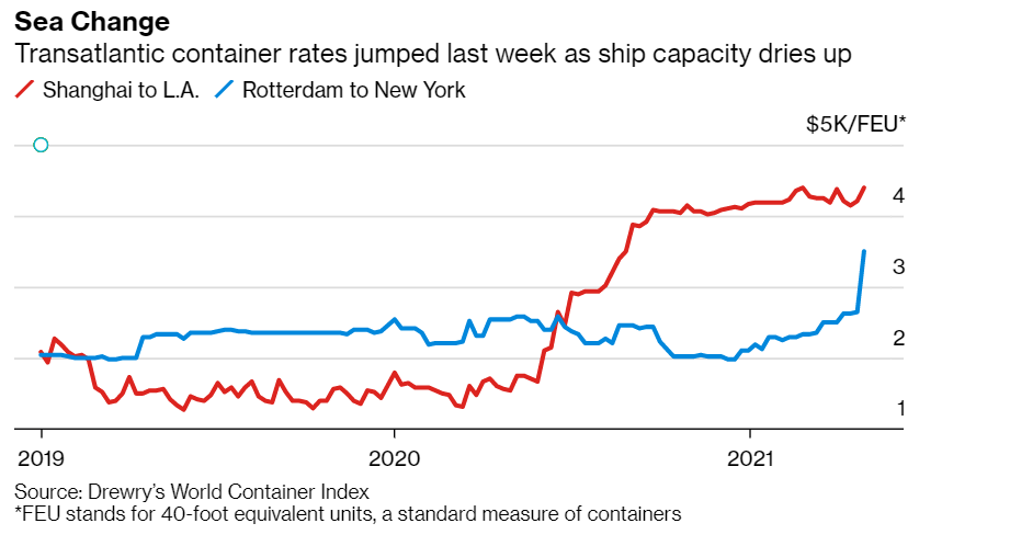 集装箱运费再次上涨,受持续不断的消费需求和公司补货推动到新高度。在2020年底达到峰值后,在第一季度基本没有变化,上周从上海到洛杉矶的40英尺集装箱运费达到4403美元,创下了追溯到2011年的Drewry世界集装箱指数数据的最高纪录。在较少使用的跨大西洋航线上,货运公司也感受到了压力:鹿特丹到纽约的运费飙升至创纪录的3500美元。