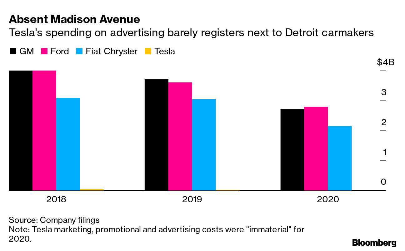 底特律的三大汽车制造商每年在广告上花费数十亿美元,而特斯拉从未在电视上播放广告或投入印刷广告。在过去的几年里,特斯拉会披露其在营销上花费的微不足道的金额:例如,2019年仅为2700万美元。在今年的年度报告中,它甚至都没有给出具体数字,称这些数字“不重要”。