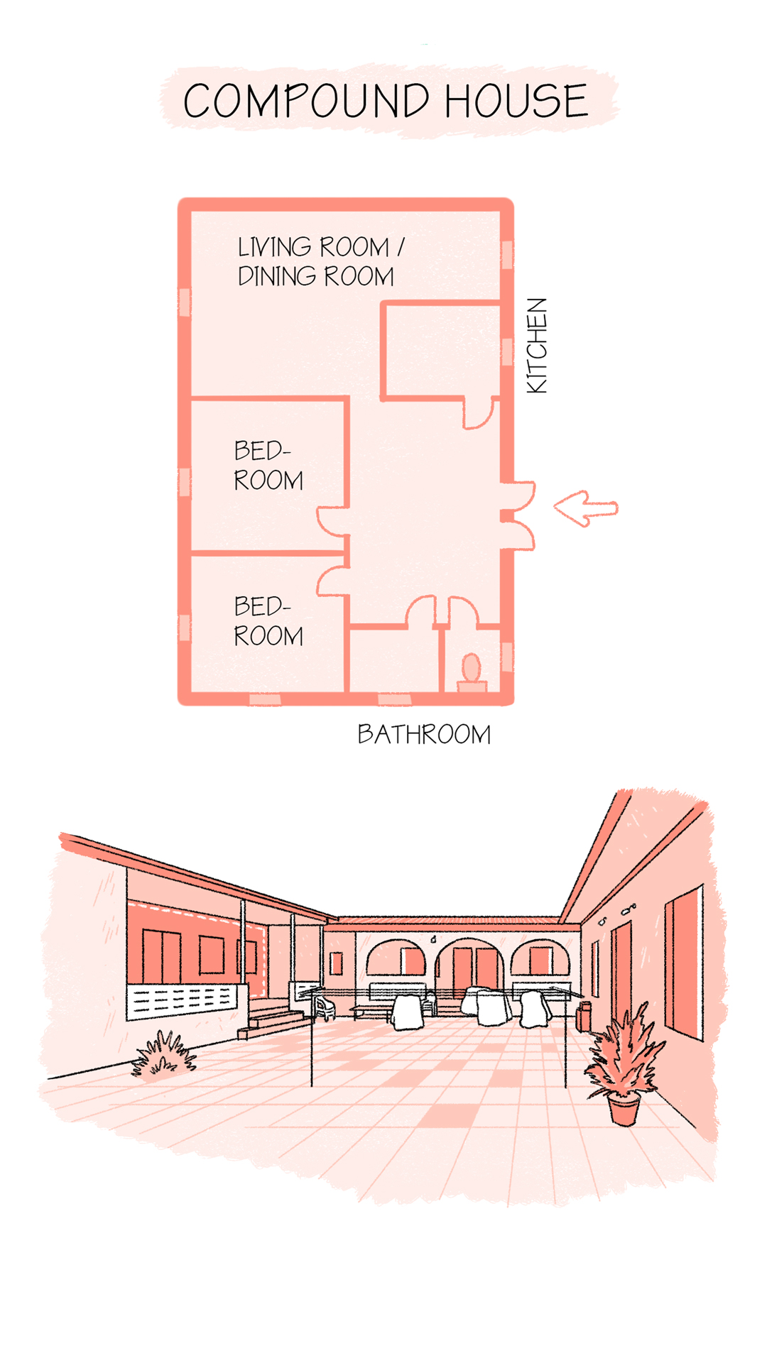 典型的复合式住宅有三到四栋砌砖平房围绕一个庭院,可用于社交或举办家庭活动,从会议到葬礼不等。