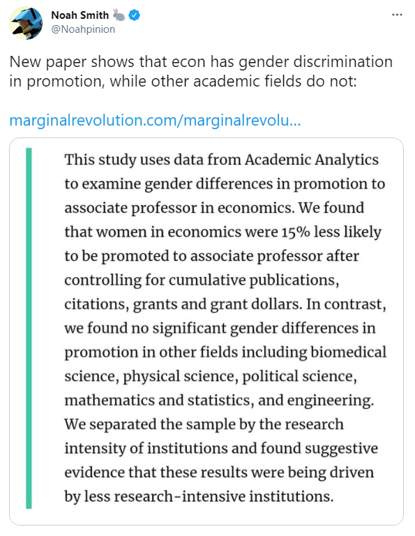 根据一项新研究,经济学领域的女性晋升为副教授的可能性要低15%,而在其他领域没有这种性别差异。