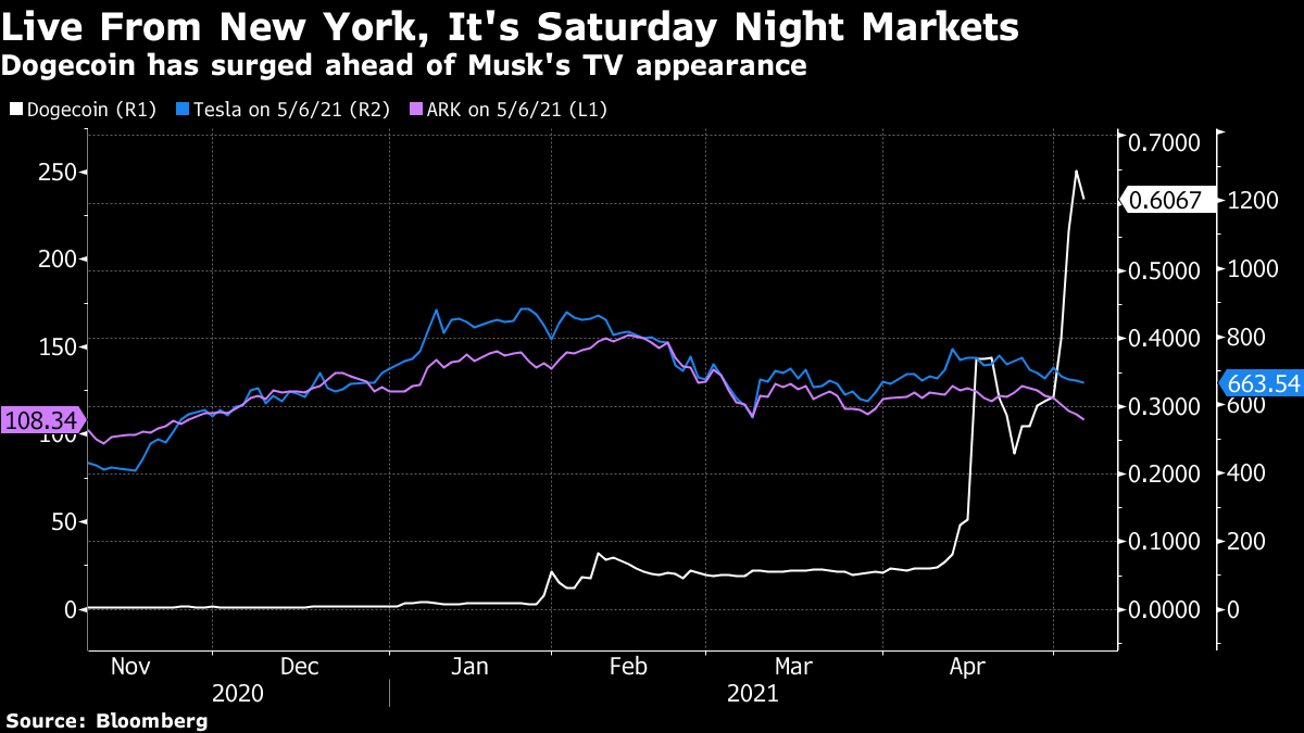 穆斯克究竟如何影响市场?我们已经看到在他出演《周六夜现场》之前,狗狗币就已经暴涨。穆斯克之前支持过这个玩笑币,有些人希望“狗父”会再次推动它,这可能会让它飙升。但如果这种情况没有发生呢?或者如果穆斯克在脱口秀中出现其他失误呢?狗狗币将在周六晚上开盘交易,可能会受到打击。特斯拉股票周一开盘时可能会下跌。这可能引发一系列事件,影响其他持仓,比如ARK基金,它们可能不得不抛售其他持仓来弥补损失。如此往复。市场正处于一个奇怪的时期,而且即将变得更加奇怪。