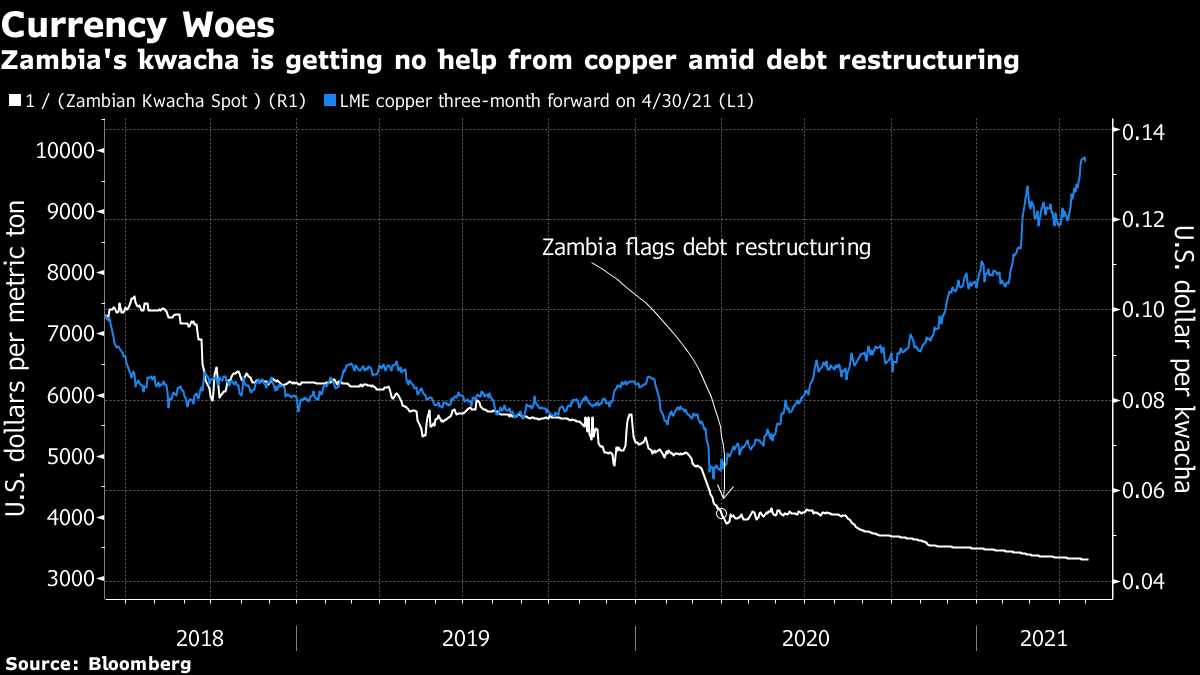 - 铜价的飙升并没有帮助赞比亚的货币,这个非洲第二大铜生产国的克瓦查兑美元汇率在过去12个月中几乎贬值了20%。