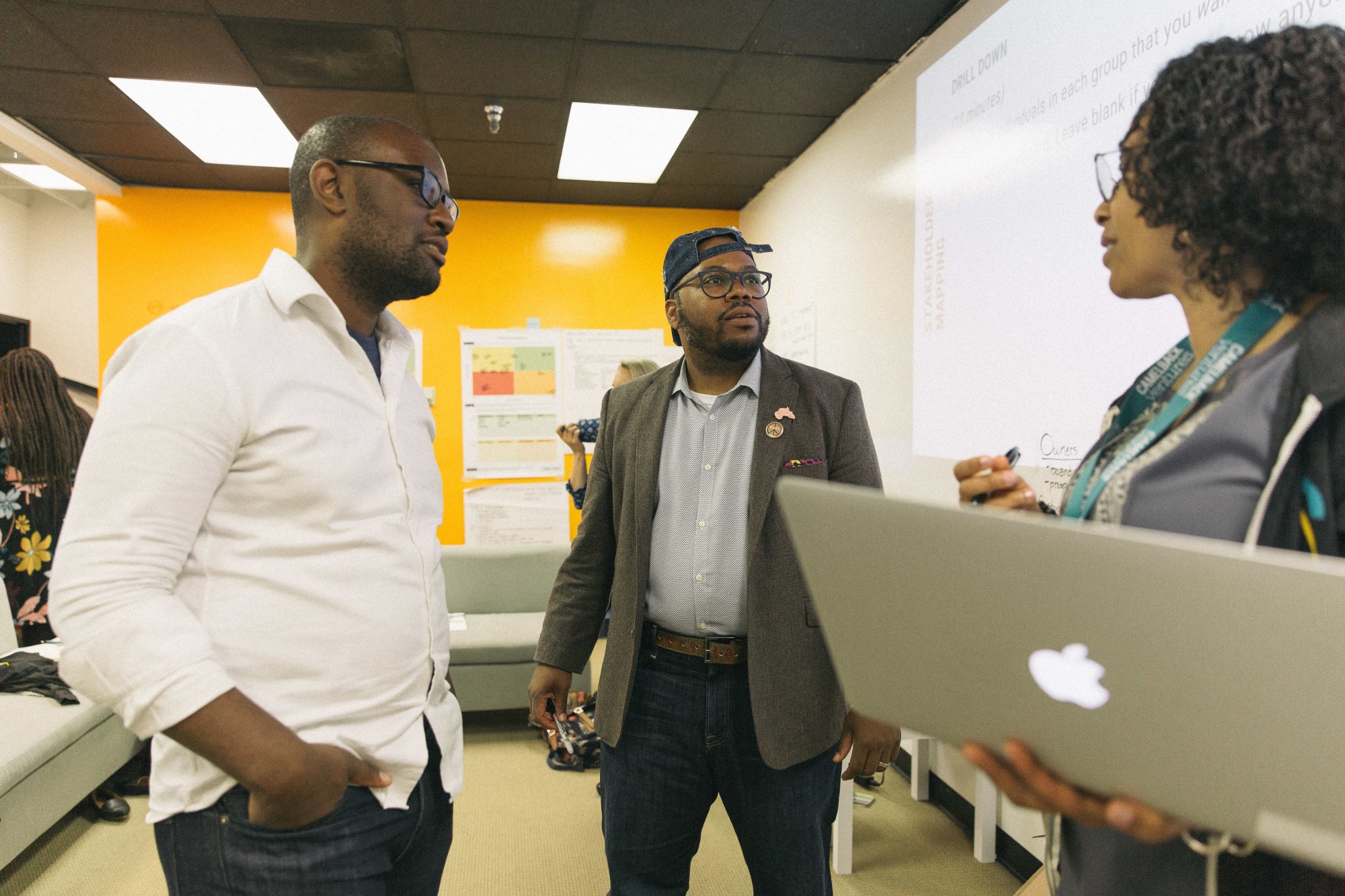 阿龙·沃克(左)是新奥尔良骆驼背风险投资创始人,与2018年骆驼背风险投资研究员社会正义学校的迈伦·朗和I Dream公立学校的珍妮·戈麦斯。