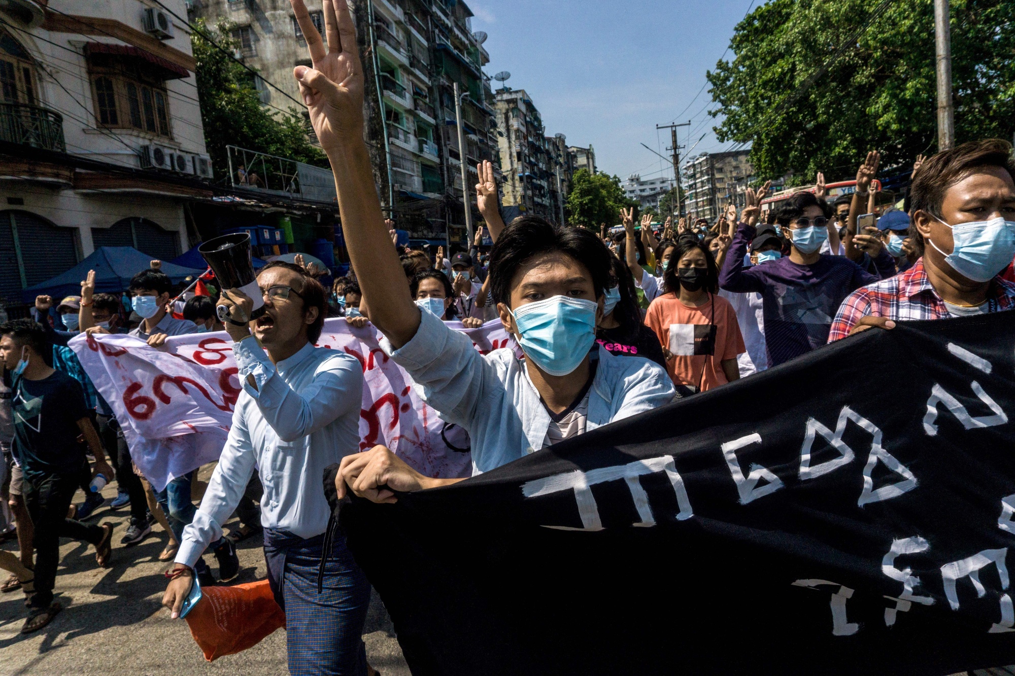 仰光5月7日反政变示威活动。摄影师:STR/AFP/Getty Images