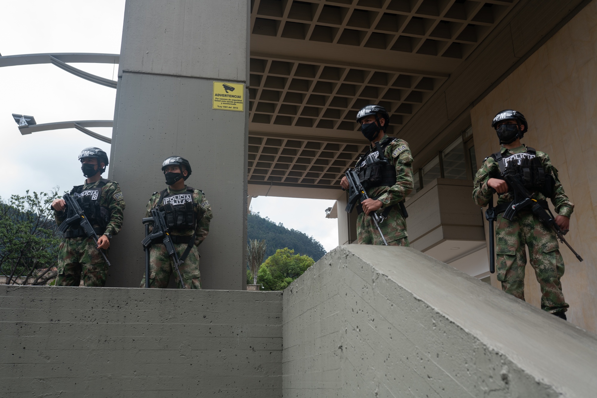 5月12日在波哥大抗议活动附近的持突击步枪的警察。哥伦比亚全国范围内的抗议活动正在加剧,抗议的内容包括一项提议的医疗保健法案、税收上涨和警察暴行。摄影师:Andres Cardona/Bloomberg### 明天你需要知道的事情