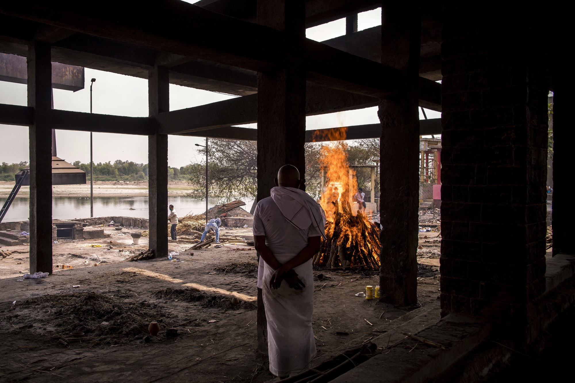 一个亲戚在阿格拉的火葬场观看一名新冠肺炎死者的火葬柴堆,时间是5月3日。
