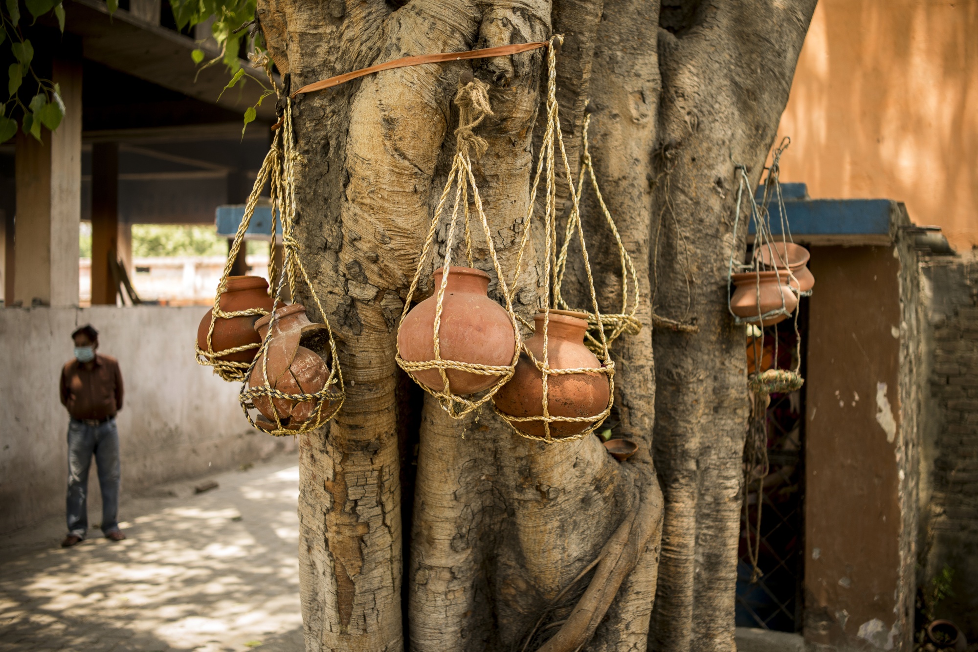 摄于5月4日,莫拉达巴德(Moradabad)火葬场一棵树上挂着装有新冠肺炎遇难者骨灰的土坛。摄影师:安迪托·穆克吉/彭博社