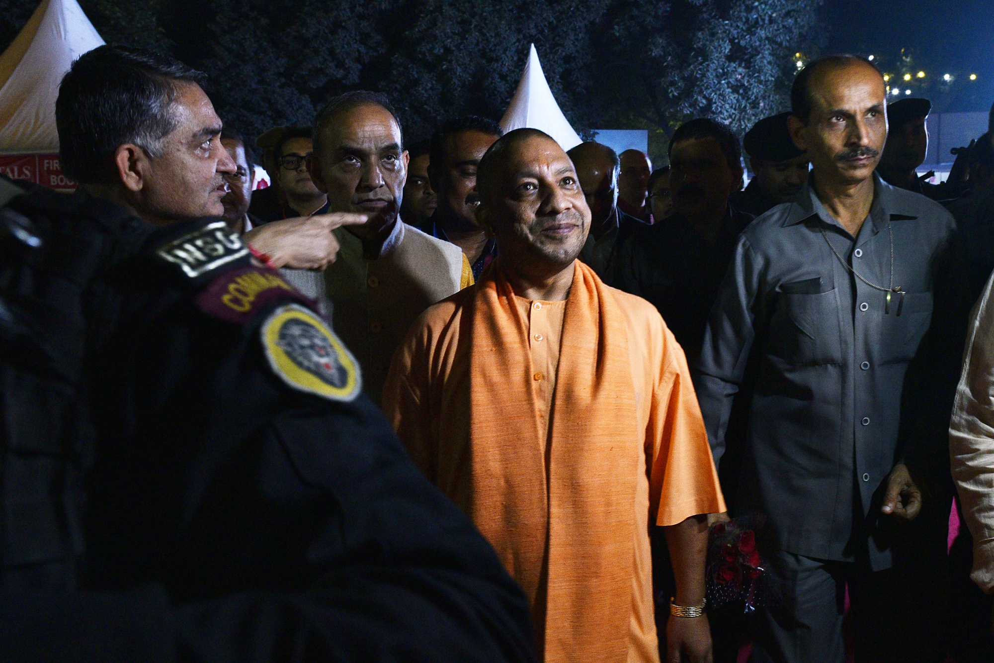 阿迪亚纳特在卢克诺 Lucknow 的 Awadh Shilpgram 文化中心和市场的揭幕典礼上登台,时间是3月19日。摄影师:T. Narayan/Bloomberg但阿迪亚纳特的记录也给美国及其盟友带来了两难,他们曾赞扬印度是一个民主力量,有助于抵制中国。美国国务院批评了北方邦的一些政策,当地政府已开始从反对基于宗教的公民法的抗议者那里没收财产,并在跨宗教婚姻后限制转变,声称穆斯林男子利用浪漫来诱使印度教女子改信伊斯兰教。
