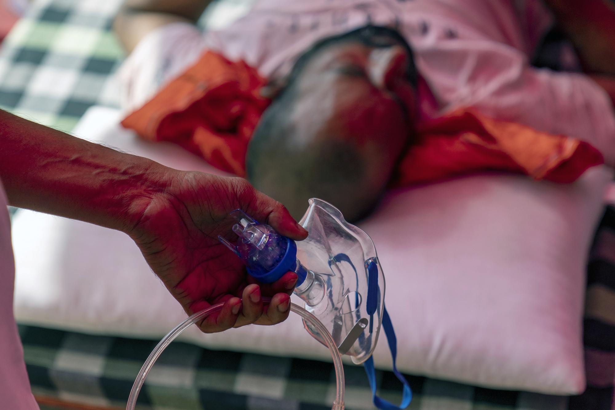 一名卫生工作者准备为印度加济阿巴德的一名新冠肺炎患者提供免费氧气,时间为周二。