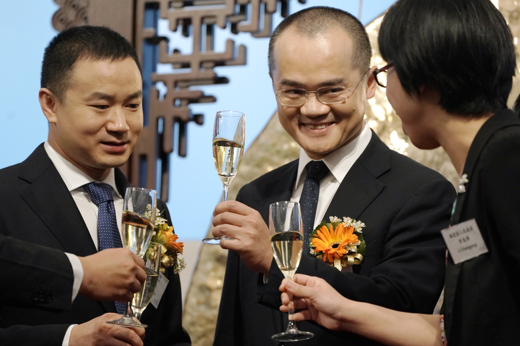 王兴,美团点评董事长,中间,和高级副总裁穆荣军,左边,举起酒杯,在2018年香港证券交易所的上市仪式上为其干杯。