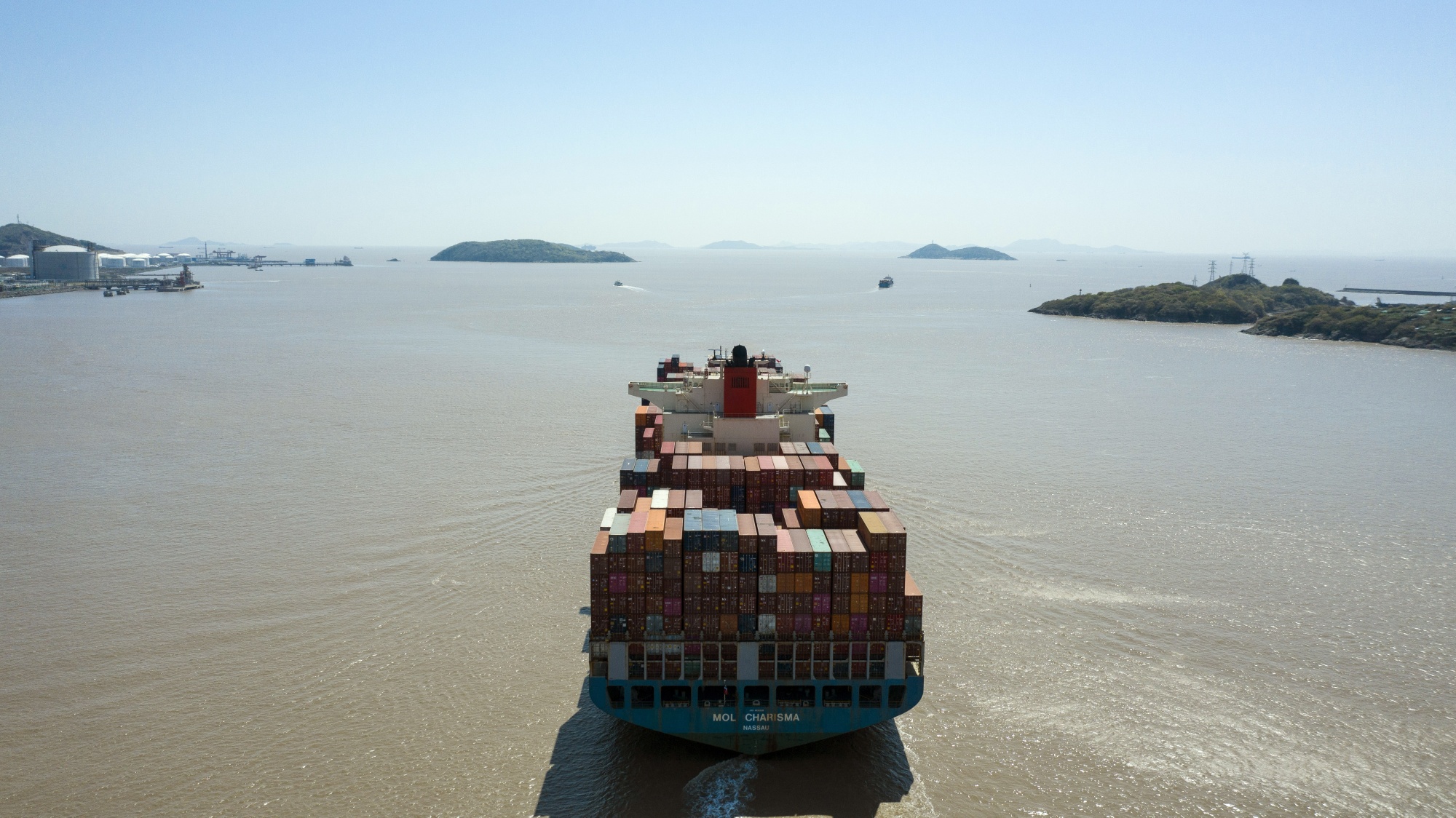 一艘货船离开上海洋山深水港。摄影师:Qilai Shen/Bloomberg