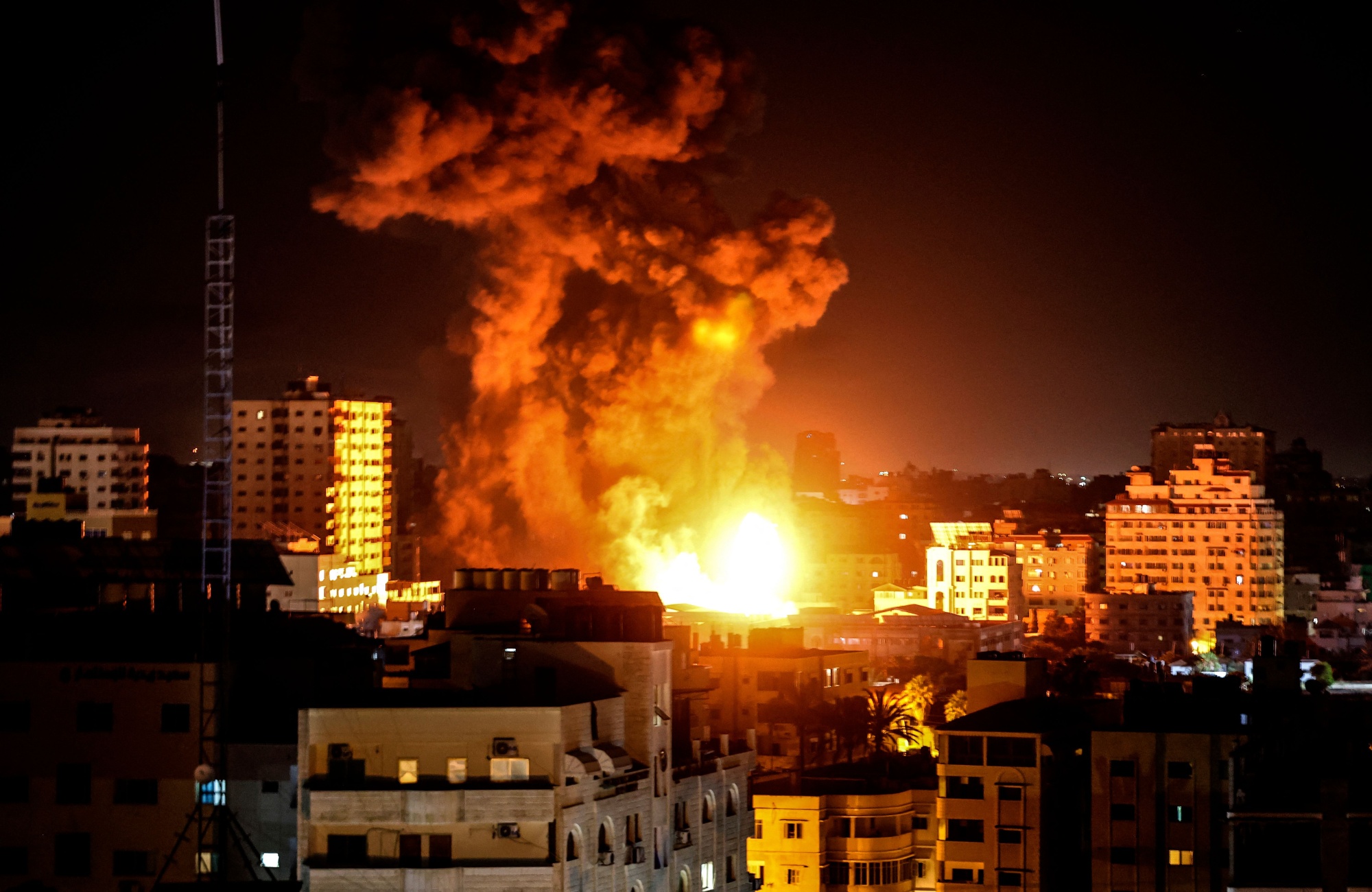 以色列战机于5月17日袭击加沙市,火光和烟雾升腾。