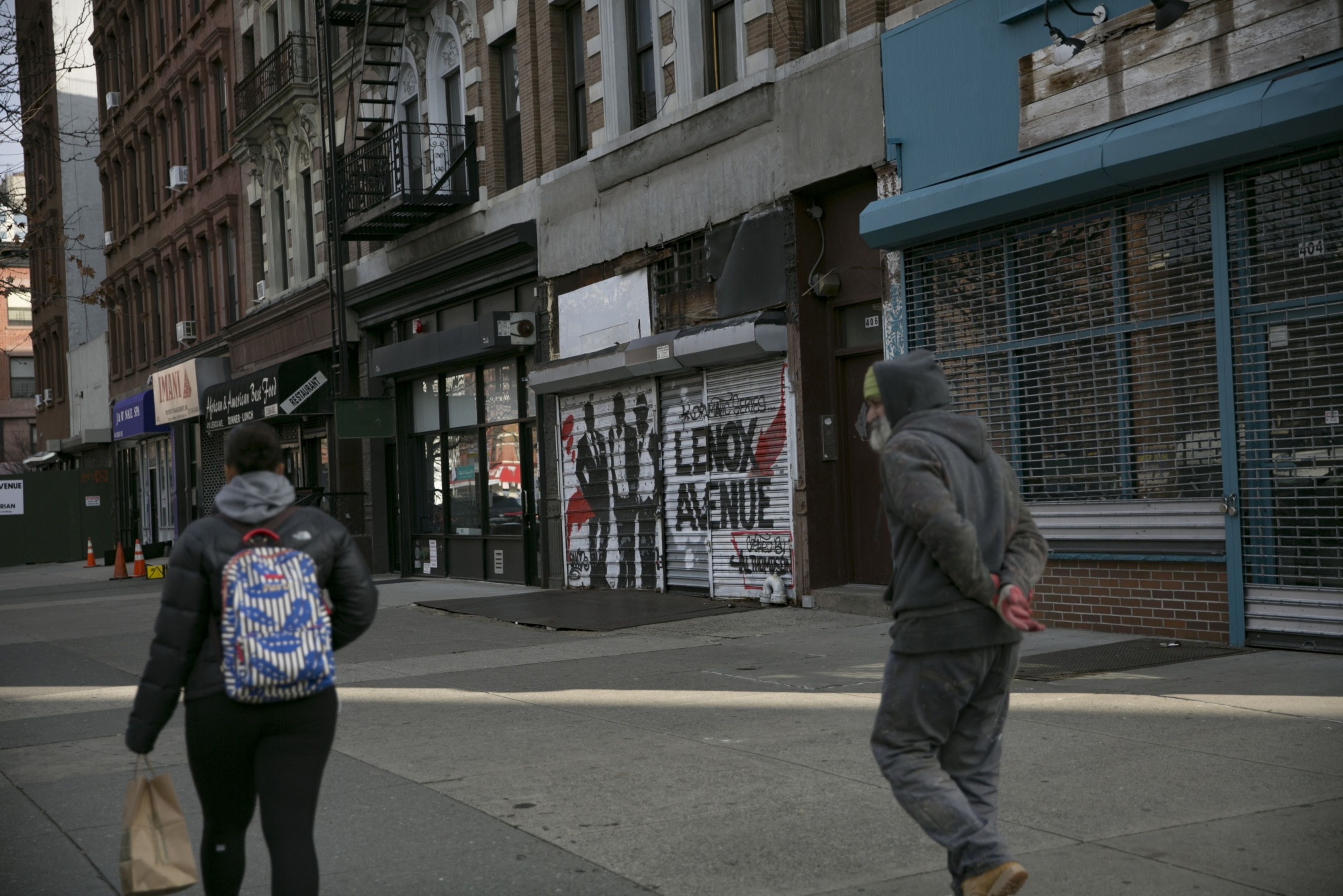 行人们在2018年12月走过纽约东哈莱姆社区的一家空置店面。