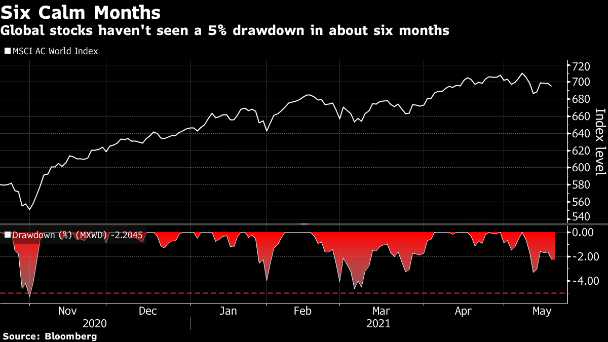 尽管科技股最近出现波动,加密货币等风险资产也出现波动,但全球股市在过去六个多月中表现出惊人的稳定。根据彭博社编制的数据,自去年11月以来,MSCI AC全球指数尚未经历过5%的回撤,这是自2017年以来最长的平静时期。然而,此前类似幅度的连续没有小幅回调(至少在对美国股市的研究中)已经导致随后一个月的回报较差,最近一份报告中,日晷资本研究公司创始人杰森·戈普费特写道。市场参与者中越来越多地感到,一个适度的调整可能已经到来。
