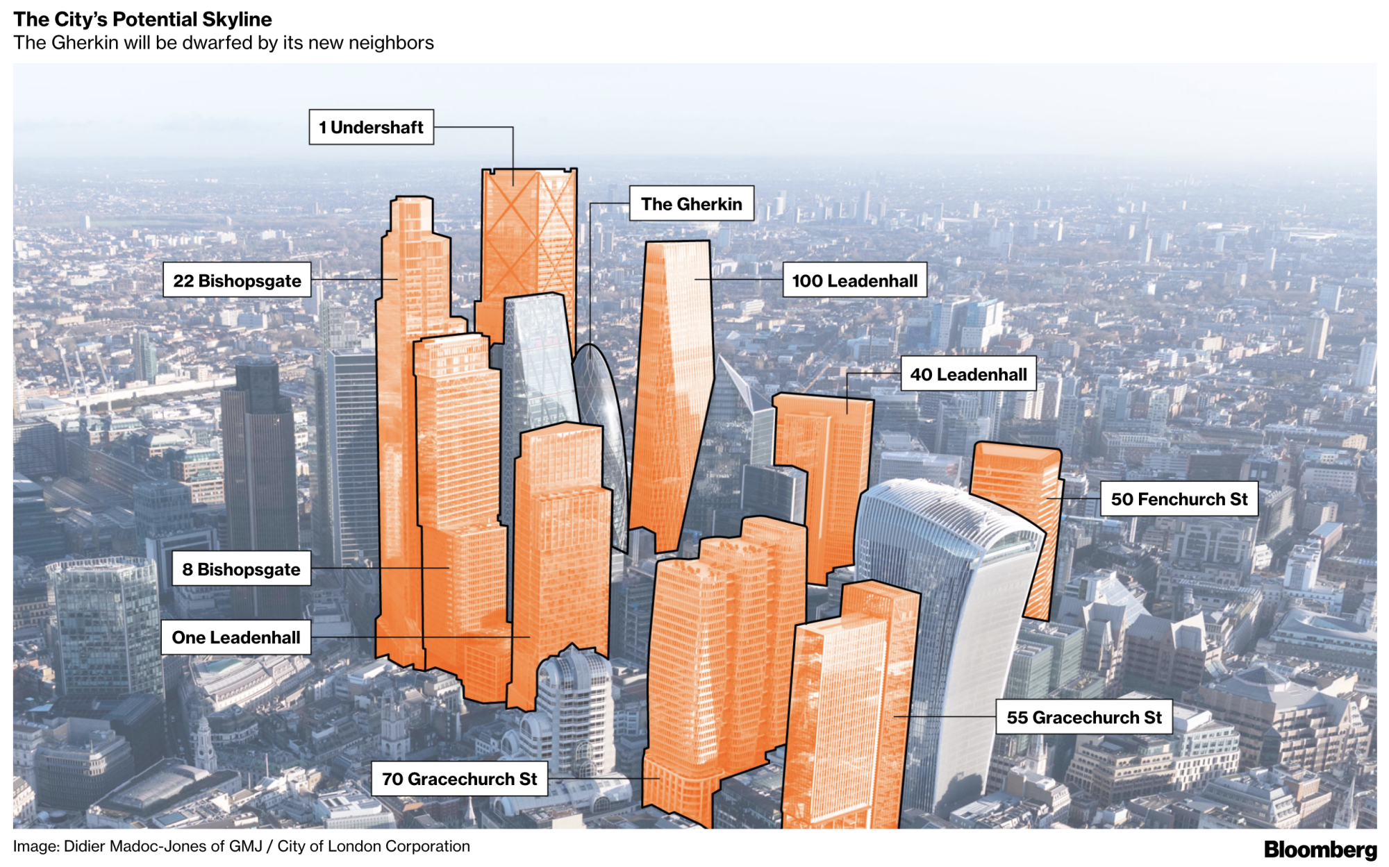 伦敦的天际线在17年前发生了变化,随着被称为“小黄瓜”的塔楼的竣工,向高层建筑转变。它是伦敦市仅有的四座比圣保罗大教堂更高的建筑之一。这个数字可能在本十年内跃升至接近40座,因为一系列新的计划中的摩天大楼将继续建设,这场建筑热潮将抵制疫情导致的居家办公趋势。这种投资对现有房东构成了警告:重返办公室的人们正在寻找新的东西,而不是无尽的办公桌。
