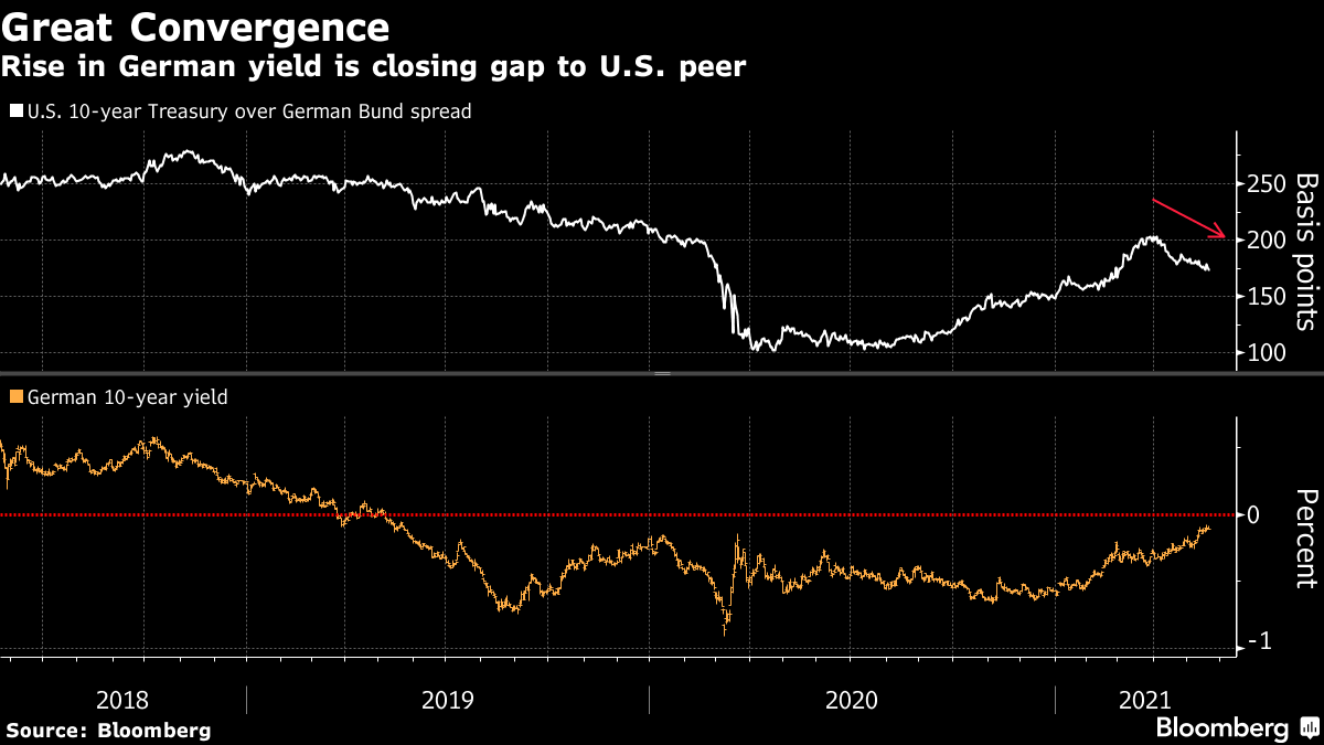 德国的选举距离只有四个月,有人认为政治也在助长债券市场的困境。有人谈论说,随着绿党在一些民调中的崛起,德国国债可能会受到影响,因为人们对政府支出增加的预期也在上升,而现任总理安格拉·默克尔的保守联盟正在失去支持。