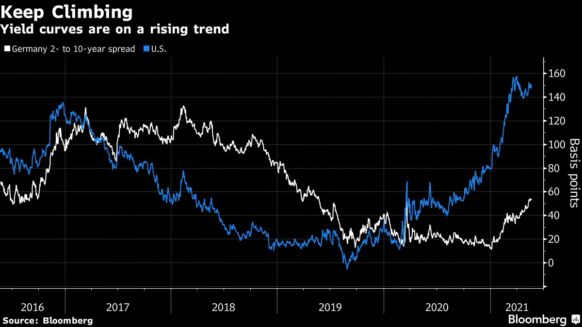 这种将复苏/通胀接力棒交给欧洲的举措已经在世界主要主权市场的投资者中引发了某种程度的轮换。施罗德投资管理公司的固定收益投资组合经理凯莉·伍德(Kellie Wood)是那些已经将他们在美国的轻仓位转移到英国和欧洲的人之一。“欧洲央行将会处于一个收益率随着非常健康的增长和通胀结果而上升的阶段,这是我们几十年来在欧洲从未见过的情况,”她说。