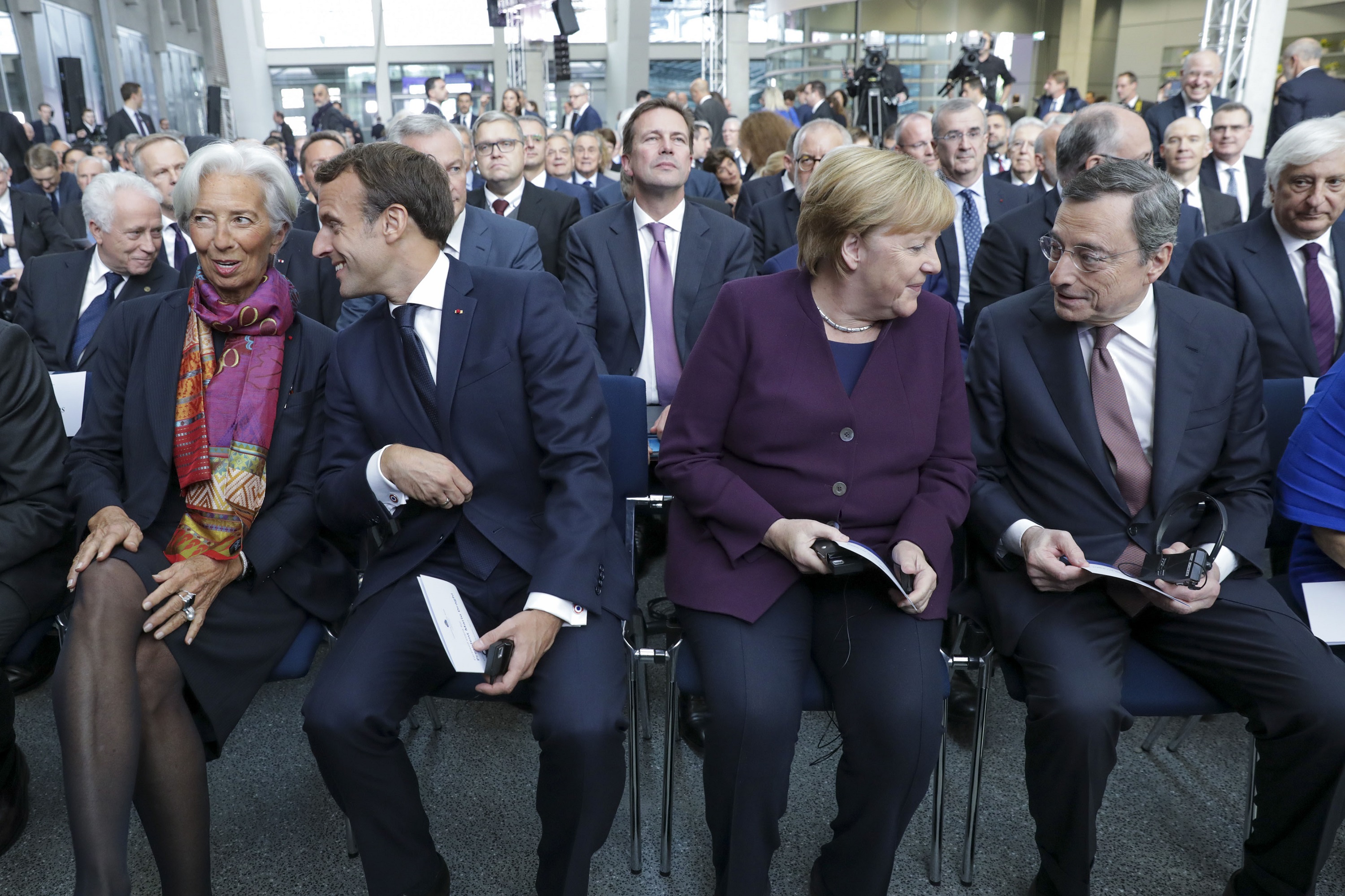 从左到右,前国际货币基金组织(IMF)总裁、即将出任欧洲央行(ECB)主席的克里斯汀·拉加德(Christine Lagarde)坐在法国总统埃马纽埃尔·马克龙(Emmanuel Macron)、德国总理安格拉·默克尔(Angela Merkel)和即将卸任欧洲央行(ECB)主席的马里奥·德拉吉(Mario Draghi)旁边,参加2019年10月28日周一在德国法兰克福举行的德拉吉告别仪式。摄影师:彭博社/Bloomberg欢迎阅读《每周要闻》,怀疑缩减购债引发的市场恐慌将被推特传播。— 艾米丽·巴雷特(Emily Barrett),跨资产记者/编辑