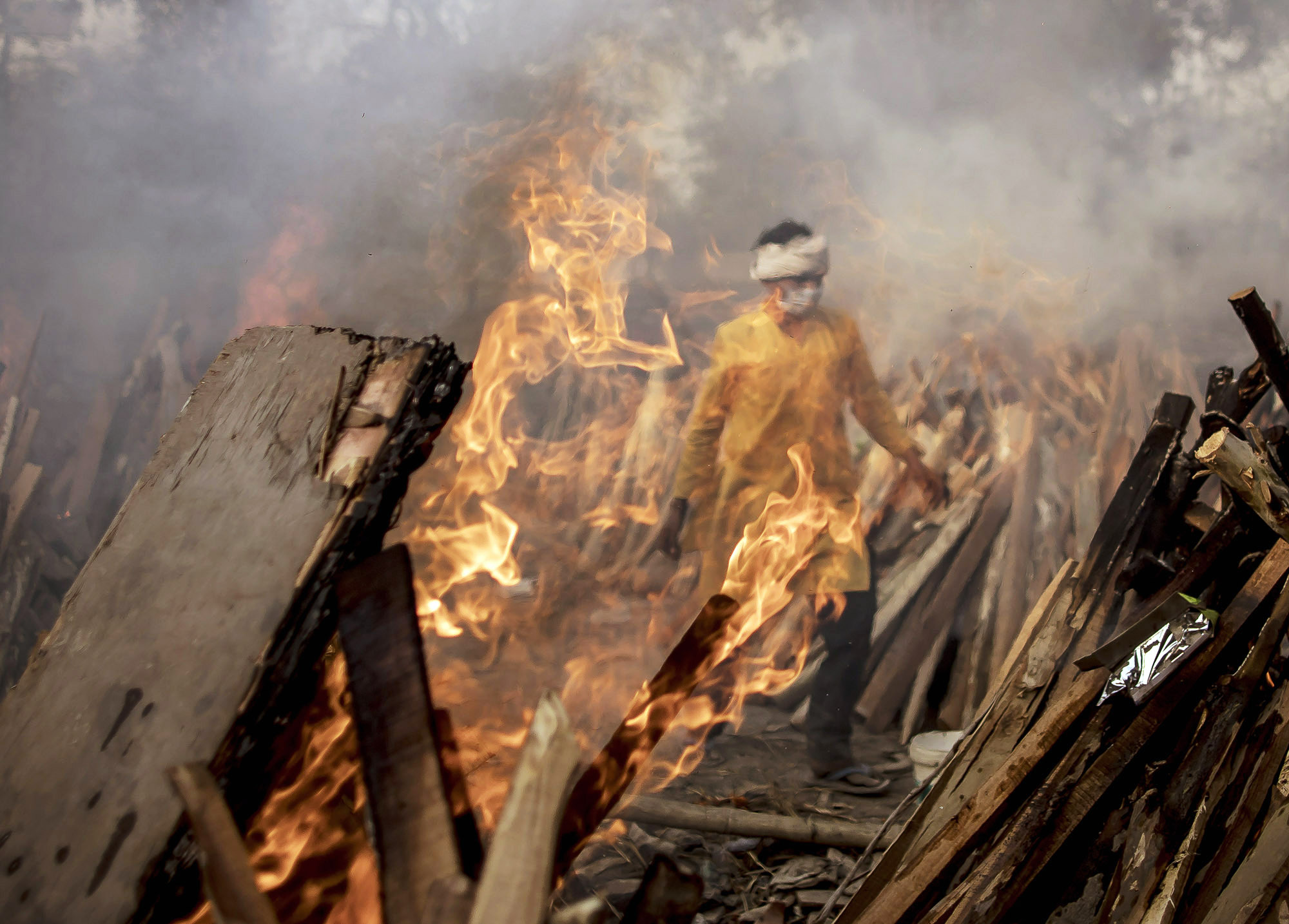 在新德里,一名在火葬场工作的牧师在因Covid-19去世的患者的火葬柴堆中被发现。