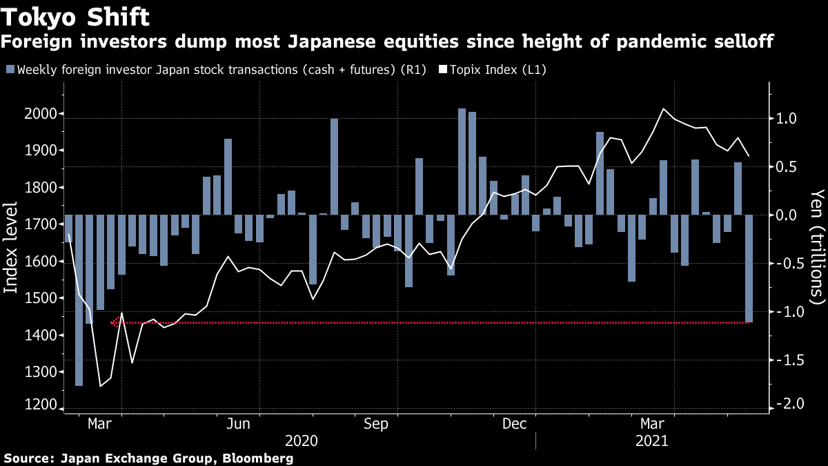他们没有被邀请参加奥运会,现在外国人似乎正在背弃日本股市。根据最新的交易数据,截至5月14日的一周内,海外投资者抛售了价值102亿美元的日本股票和期货。正如我的同事Kurt Schussler在上周五指出的那样,这是自2020年3月疫情爆发期间以来最多的一次。在资金外流的那一周,对全球股市上涨的担忧推动了日本股市接近技术性修正的边缘。但是,对于日本缺乏通胀的担忧也必定会在投资者心中占据一席之地,尤其是对那些受国内经济影响最大的股票。日本的主要通胀指标显示,与全球同行形成鲜明对比,4月份价格连续第九个月下跌。