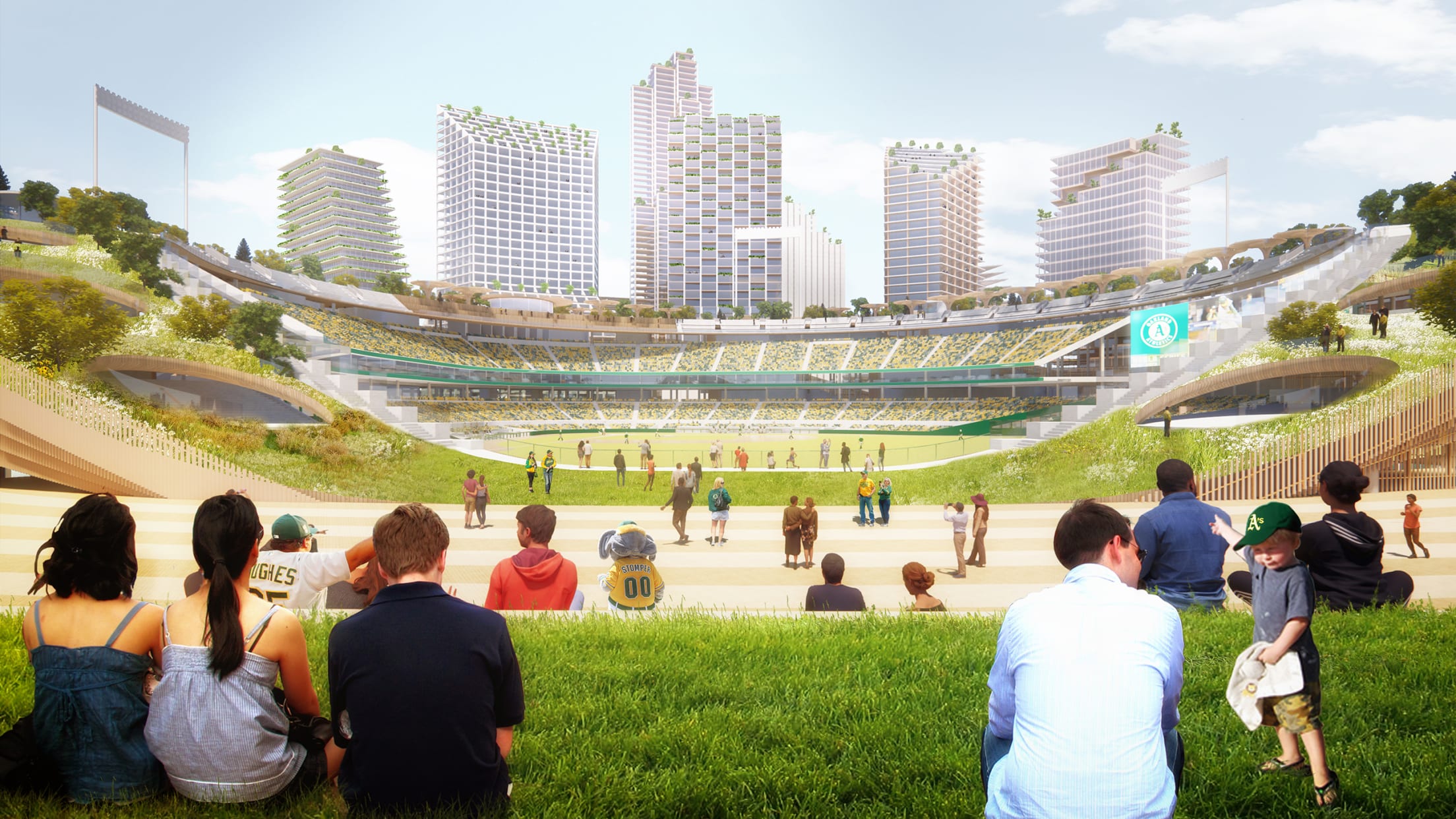 新A队棒球场区的设计由Bjarke Ingels Group完成,展示了一个带有上层屋顶绿地的体育场,周围环绕着混合用途开发。渲染图由奥克兰竞技提供在体育场周围,将出现一个新的棒球场区,拥有27万平方英尺的零售空间,400间酒店客房和一个3500座的表演中心,另外还有3000套公寓单位和一辆吊箱,用于将球迷从最近的BART站运送到球场。体育场本身及其周边开发将由私人资金支持;如果全部建成,球队估计成本约为120亿美元。A队表示,他们的提议可能创造35,000个新工作岗位,并在球场寿命内为该市带来70亿美元的新收入。