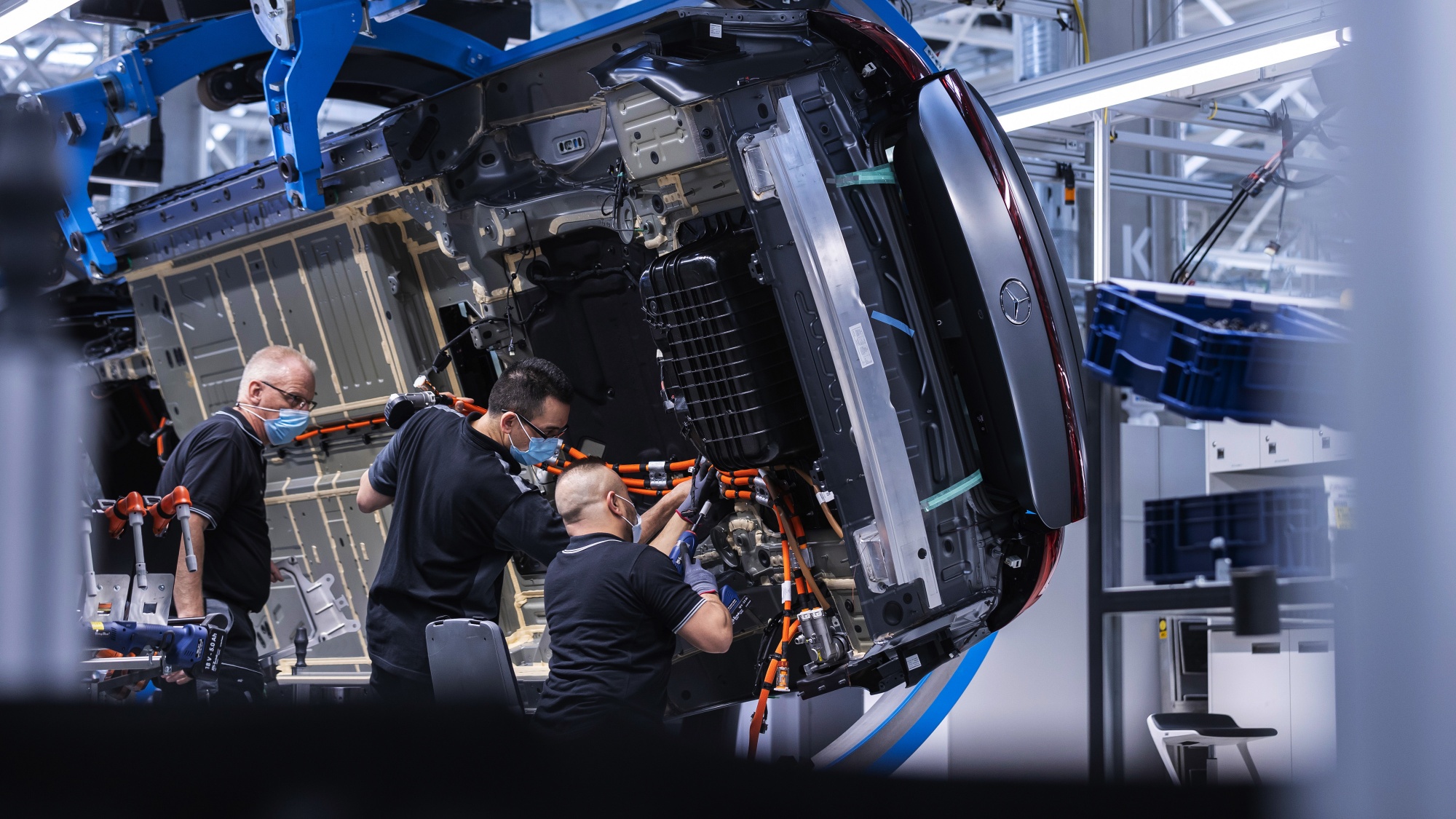 在德国辛德尔芬根的戴姆勒工厂组装梅赛德斯-奔驰EQS电动汽车。