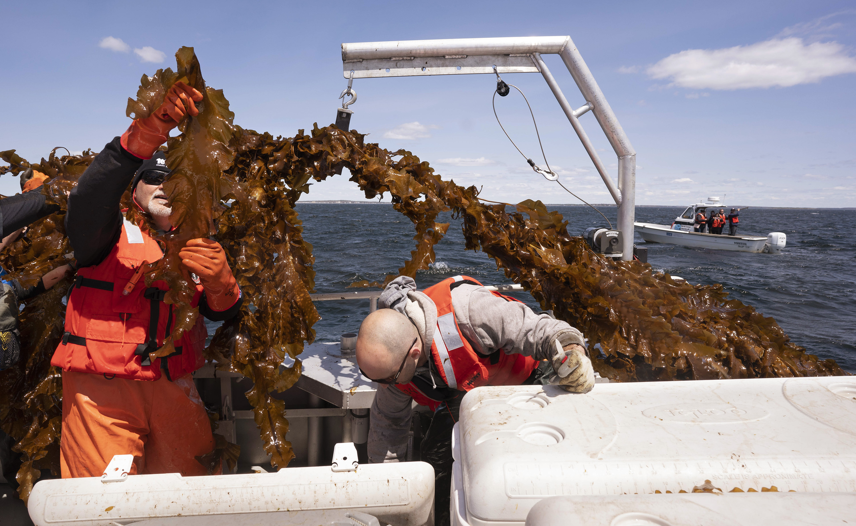 Barry Costa-Pierce,左,检查一片海带,而Adam St. Gelais在2019年在缅因州Saco Bay的一艘船上将海藻装入冷藏箱。摄影师:波特兰新闻先驱报/喜欢获取晚间简报*?订阅Bloomberg.com,获取无限访问权,信赖数据驱动的新闻,并从独家订阅者专享的专家分析中获益。*