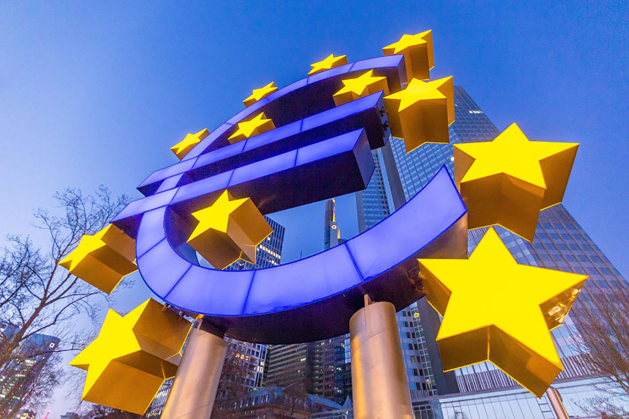 在法兰克福欧洲中央银行大楼前的欧元标志雕塑。