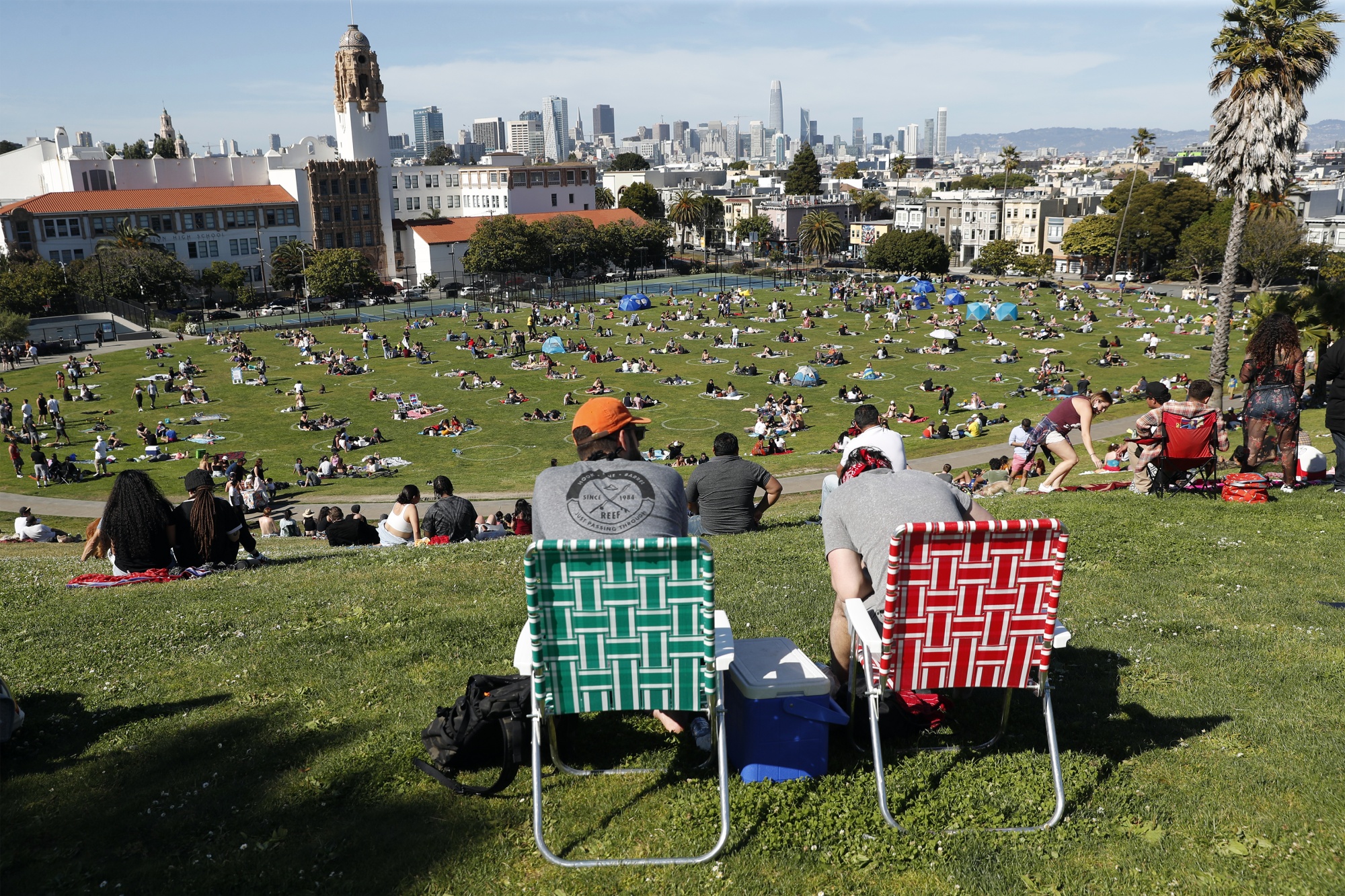 2020年5月,人群在旧金山的多洛雷斯公园保持社交距离。
