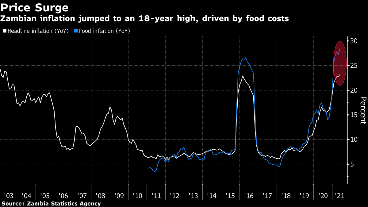 - 赞比亚的通货膨胀率在5月份跃升至23.2%,为18年来的 最高水平,受到肉类和鱼类价格飙升的推动。这一指标已经超过央行6%至8%的目标范围两年多。