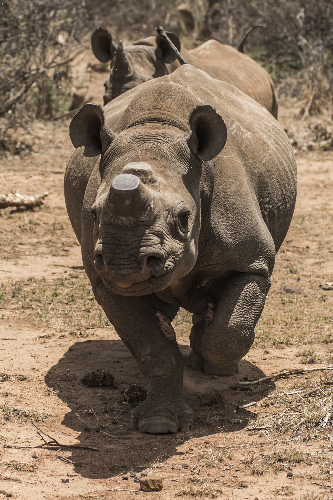 一对稀有的黑犀牛,其中一只的角被移除作为反偷猎措施。摄影师:Waldo Swiegers