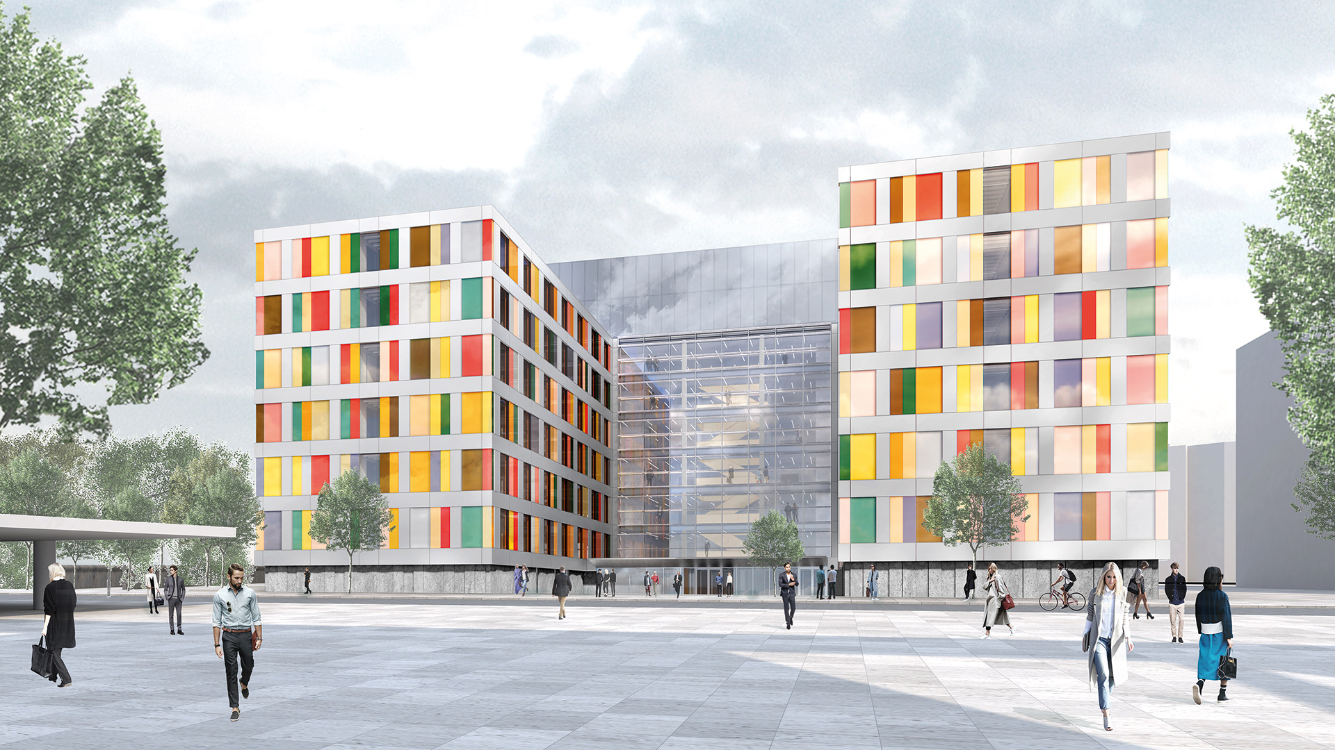 一幅计算机生成的图像展示了Luisenblock West立面上的多彩面板。