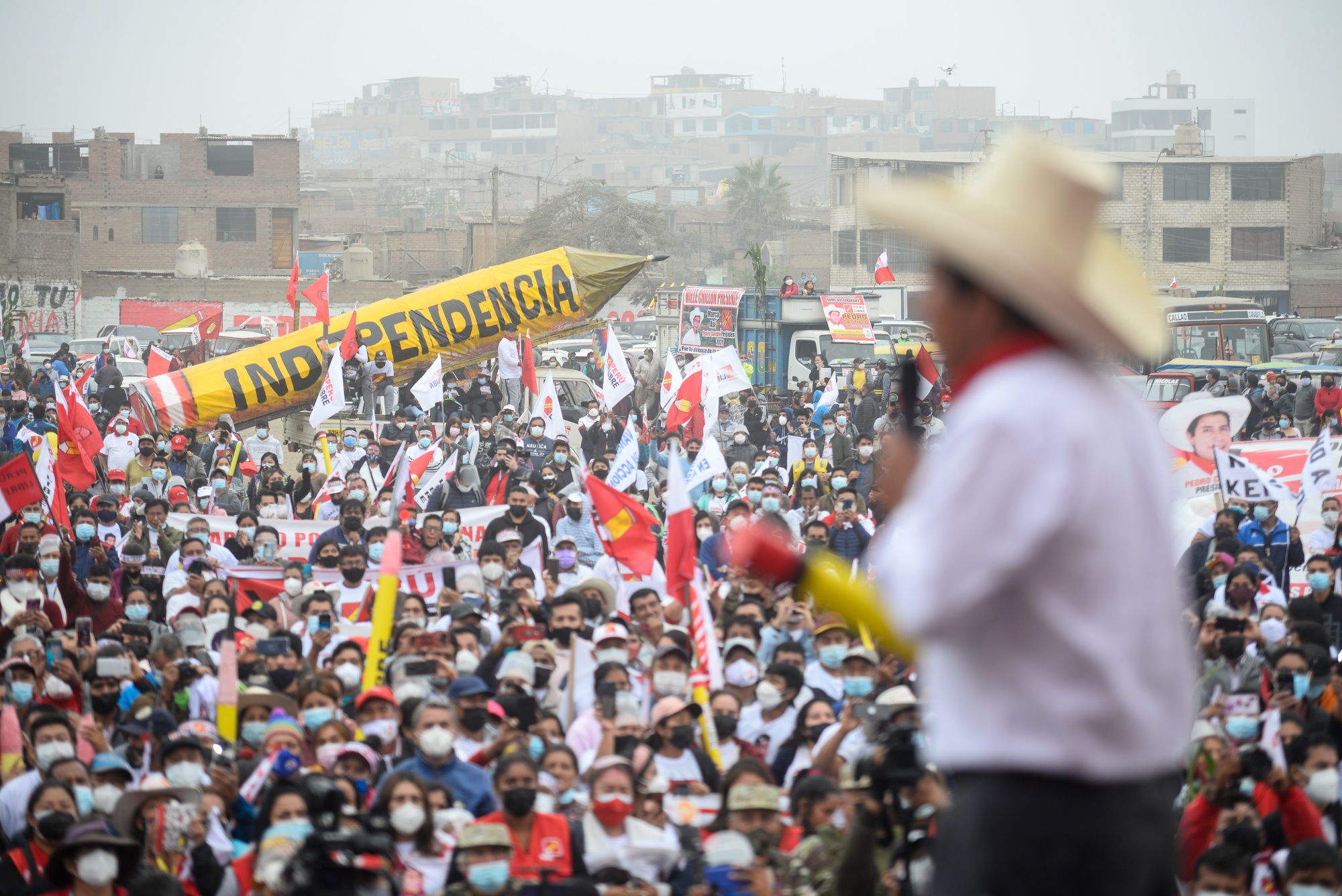 秘鲁自由党总统候选人佩德罗·卡斯蒂略在秘鲁利马的竞选集会上讲话,日期为5月27日。