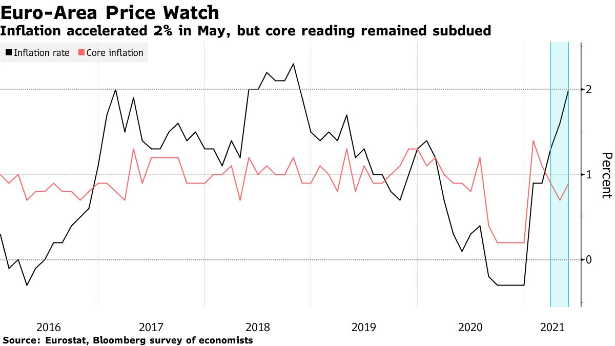 欧元区的通胀在五月份上升到了两年多来的最高水平,在该地区的经济开始解除病毒限制并且需求反弹加剧了供应瓶颈。欧洲央行强调价格上涨可能是暂时的,并且现在谈论退出货币支持还为时过早。