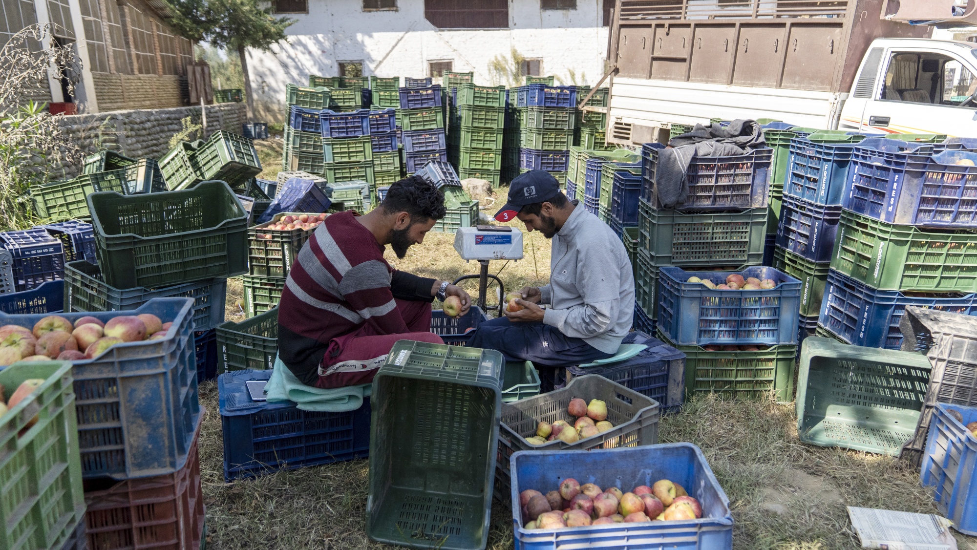 工人们在印度克什米尔的一个仓库里检查苹果。
