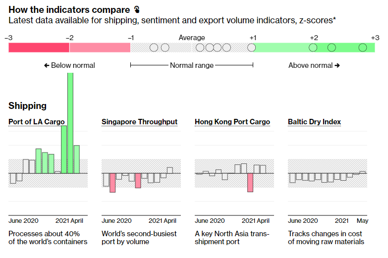 全球贸易指标飙升,供应迎头赶上需求,为一些出口商提供了救生圈,因为他们在与新冠病毒再次爆发的斗争中。 Bloomberg贸易追踪器 上的10个指标中有8个高于长期平均水平。大多数亚太经济体的出口已经远远超过疫情前的水平。一个特别亮点是韩国,作为全球商品贸易的晴雨表,在五月再次出货激增,为持续的强劲表现打下了良好基础。
