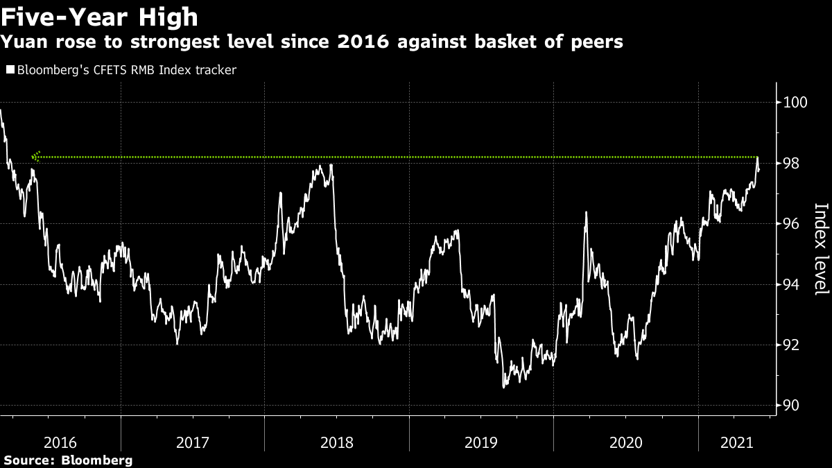 中国央行本周似乎说服了金融市场,认为人民币已经足够强劲。自2020年中期以来,当清楚中国经济将迅速从疫情中恢复时,人民币一直在稳步升值。事实上,涨幅变得如此明显,以至于上周人民银行试图控制人民币在突破数年高点后的涨势。该努力始于上周四,人民银行发布了一份措辞谨慎的声明,警告不要对货币进行单向押注。上周日,一位前央行官员告诉官方媒体,人民币“被过度买入”。然而,最大的举措发生在周一,人民银行增加了外汇储备银行必须持有的金额。市场似乎得出的结论是,央行希望遏制涨势,并且有很多工具可供使用。在连续七个交易日推高人民币后,本周的前四天,该货币要么走弱,要么保持不变。