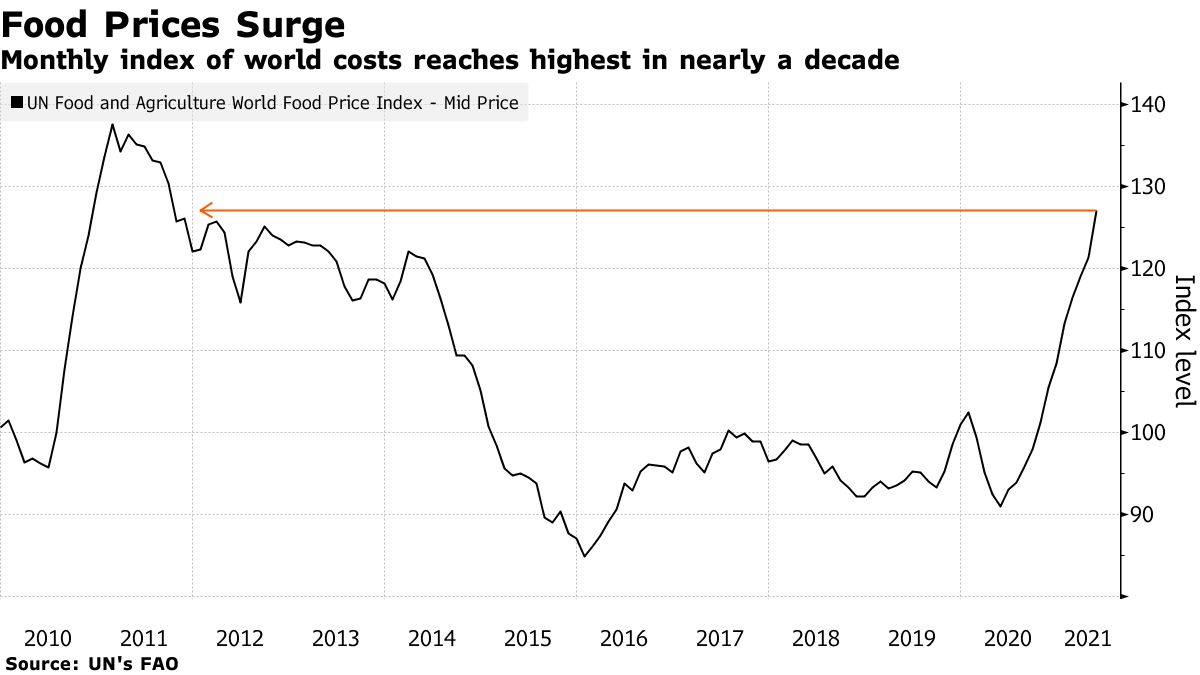 全球食品价格延续了近十年来的涨势,加剧了人们对于食品账单不断增加的担忧,因为各国经济在努力摆脱新冠疫情危机。联合国世界食品成本指数在 5 月份连续第 12 个月上涨,这是十年来最长的涨势。持续的上涨可能加剧更广泛的通货膨胀,使各国央行提供更多刺激措施变得更加复杂。