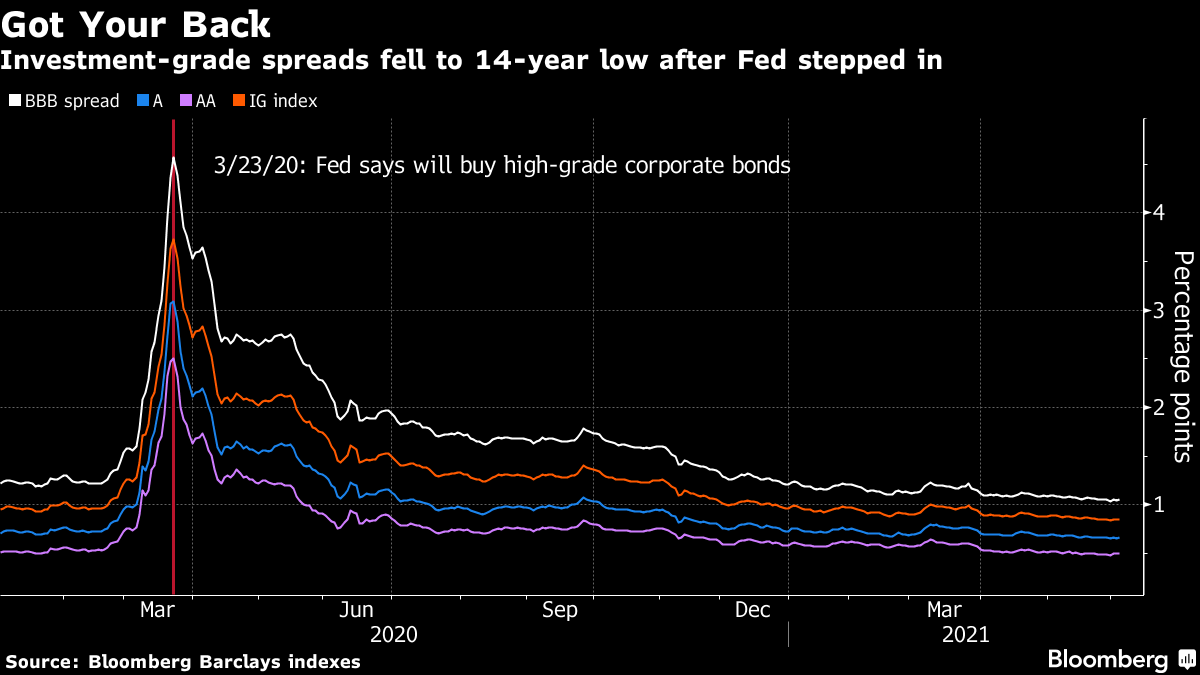 花旗分析师德鲁·佩蒂特表示:“市场在联邦储备系统甚至介入之前就已经大幅波动。现在他们开始退出,我们有一个非常好的背景,利差很小,利率较高但仍然很低,我们看到美国经济和全球其他地区的复苏和重新开放。”
